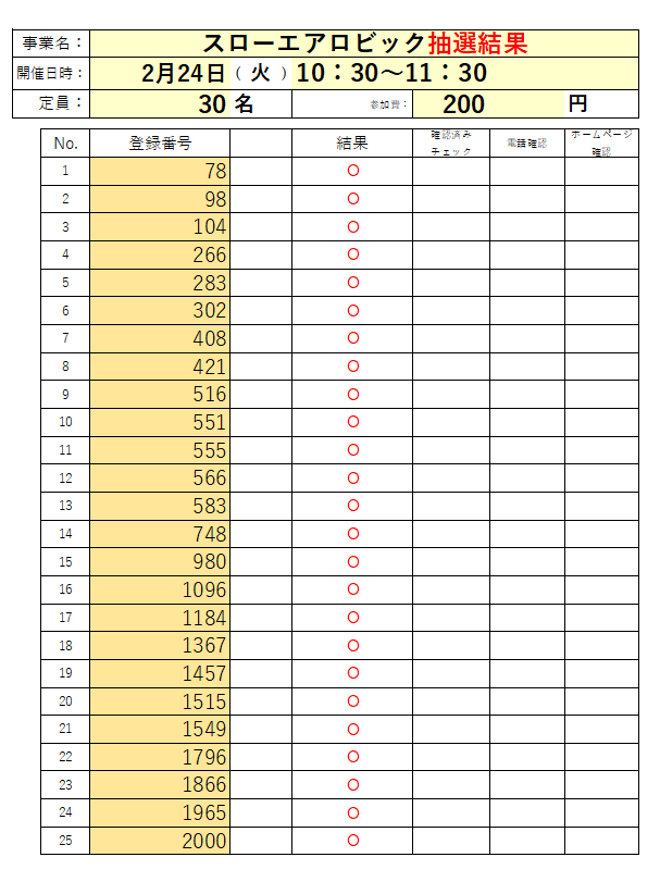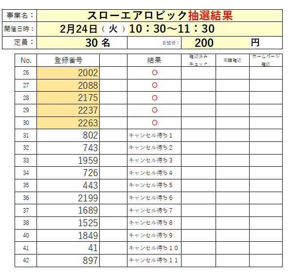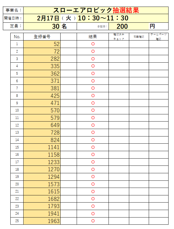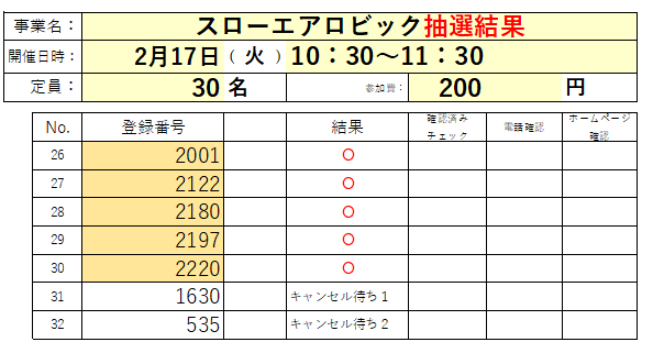 2月「スローエアロビック」の抽選結果です。