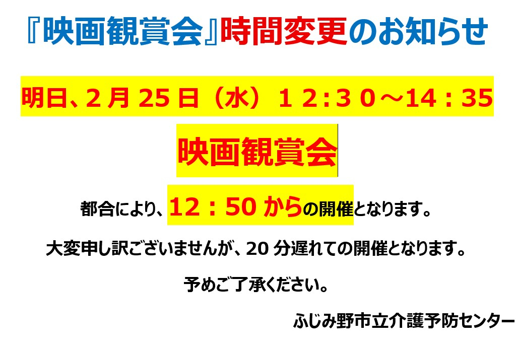 2026.02.24 お知らせ 2月25日『映画観賞会』時間変更のお知らせ Tweet シェアする 2月24日(火) 明日、2月25日(水)映画観賞会の開催時間が変更となります。 ご迷惑をおかけいたしますが、よろしくお願い申し上げます。 ふじみ野市立介護予防センター H・K 前の記事 2026.02.24 お知らせ スローエアロビック♪ 次の記事 2026.02.24 お知らせ 『介護予防フェスティバル』で測定会を実施! 一覧へ戻る