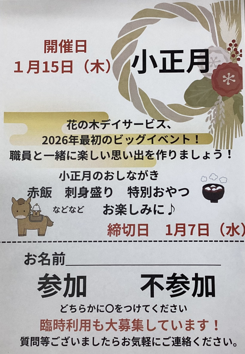 2025.12.23 【花の木デイ】小正月開催のお知らせ 活動報告 #奉優会 #デイサービス #レクリエーション #花の木デイ 2025.12.13 【花の木デイ】飾りつけ! 活動報告 #奉優会 #デイサービス #レクリエーション #花の木デイ 2025.12.10 【花の木デイ】花の木通信更新🆙 活動報告 #奉優会 #デイサービス #レクリエーション #花の木デイ 2025.12.02 【花の木デイ】ドッグセラピー 活動報告 #奉優会 #デイサービス #レクリエーション #花の木デイ 2025.12.01 【花の木デイ】献立表 お食事 #奉優会 #デイサービス #レクリエーション #花の木デイ 2025.12.01 【花の木デイ】12月の活動! 活動報告 #奉優会 #デイサービス #レクリエーション #花の木デイ 2025.11.13 【花の木デイ】ネイル♪ 活動報告 #奉優会 #デイサービス #レクリエーション 2025.11.13 【花の木デイ】餃子パーティーのお知らせ 活動報告 #奉優会 #デイサービス #レクリエーション #花の木デイ 2025.11.10 【花の木デイ】フラワーアレンジメント♪ 活動報告(IN) #奉優会 #デイサービス #レクリエーション #花の木デイ #フラワーアレンジメント 2025.11.07 【花の木デイ】花の木通信を発行しました! 活動報告 #奉優会 #デイサービス #レクリエーション #花の木デイ 2025.11.01 【花の木デイ】献立 活動報告 2025.11.01 【花の木デイ】11月活動表 活動報告 #奉優会 #デイサービス #レクリエーション #花の木デイ 2025.10.29 【花の木デイ】ドッグセラピー 活動報告 #奉優会 #デイサービス #レクリエーション #花の木デイ 2025.10.28 【花の木デイ】誕生会♪ 活動報告 #奉優会 #デイサービス #レクリエーション #花の木デイ #お誕生日会 2025.10.11 【花の木デイ】花の木通信 活動報告 #奉優会 #デイサービス #レクリエーション #花の木デイ 1 2 3 4 5 … 32