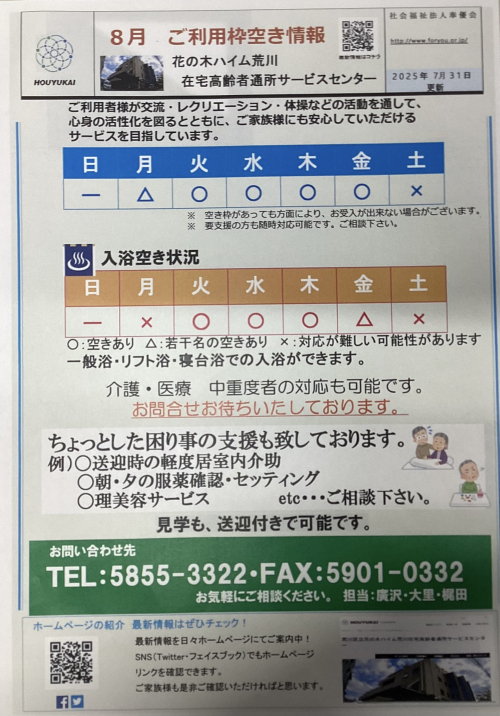 2025.08.01 【花の木デイ】空き情報のご案内 活動報告 #奉優会 #デイサービス #介護 #花の木デイ 2024.10.12 【花の木デイ】フラワーアレンジメント 活動報告 #奉優会 #デイサービス #レクリエーション #介護 #花の木デイ #仲町ふれあい館へどうぞ!! 2024.10.10 【花の木デイ】カラオケ&壁紙制作 活動報告 #奉優会 #デイサービス #レクリエーション #介護 #花の木デイ 2024.08.15 【花の木デイ】柴犬先輩♪ 活動報告 #奉優会 #デイサービス #レクリエーション #介護 #花の木デイ 2024.07.16 【花の木デイ】これは何でしょう 活動報告 #デイサービス #奉優会 #レクリエーション #介護 #花の木デイ 2024.07.15 徒歩送迎(*^-^*) お知らせ #デイサービス #奉優会 #介護 #福祉 2024.07.13 【花の木デイ】土曜日のレクリエーション 活動報告 #デイサービス #奉優会 #レクリエーション #介護 #花の木ハイム #花の木デイ 2024.06.28 【花の木デイ】午後の素敵なひととき 活動報告 #デイサービス #介護 #花の木デイ 2024.06.19 【花の木デイ】可愛いわんちゃん達とのふれあい 活動報告 #奉優会 #介護 #花の木ハイム 2024.05.10 【花の木デイ】何が出来るかな?? 活動報告 #デイサービス #奉優会 #介護 #レクリエーション 2024.05.06 [花の木デイ」カレンダー塗り絵 活動報告 #デイサービス #デイ #奉優会 #介護 2024.04.25 【花の木デイ】朝のひと時 活動報告 #デイサービス #奉優会 #介護 #福祉 #花の木ハイム #健康づくり #大人のぬりえ 2024.04.19 【花の木デイ】誕生日会 活動報告 #デイサービス #奉優会 #介護 #イベント #お誕生日会 #幸せ #思い出 2024.03.04 「花の木デイ」土曜日の様子 活動報告(IN) #デイサービス #介護 #花の木デイ #ゲーム