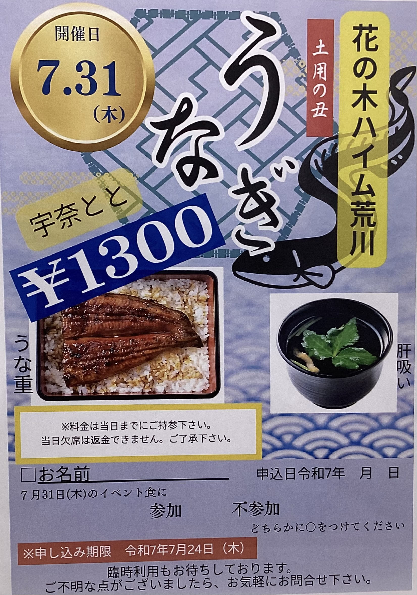 今月は土曜の丑の日でご希望の方を対象に、うな重の提供を行う予定です。