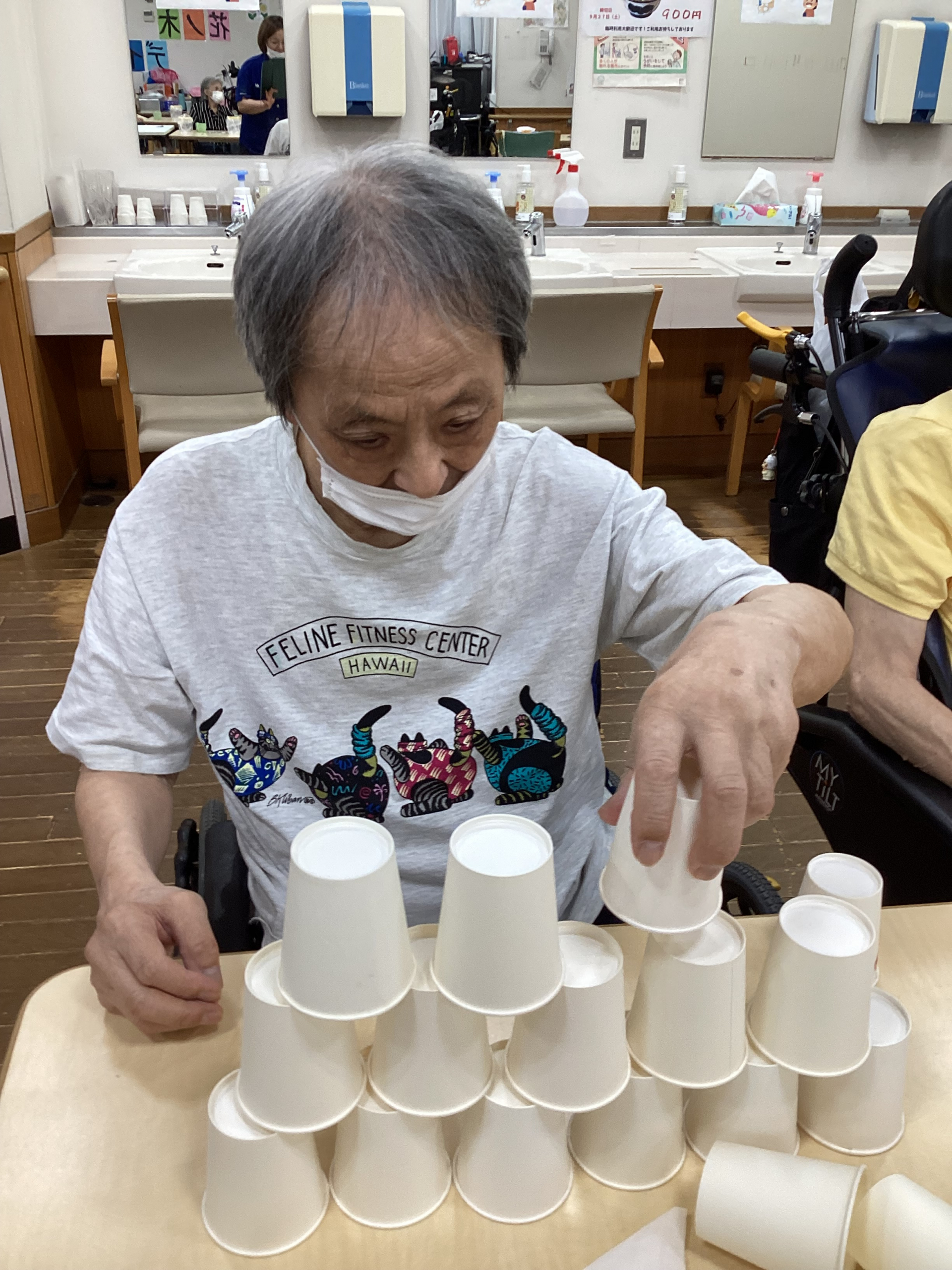 本日は自由時間に行った紙コップ並べの様子をアップさせていただきます!
