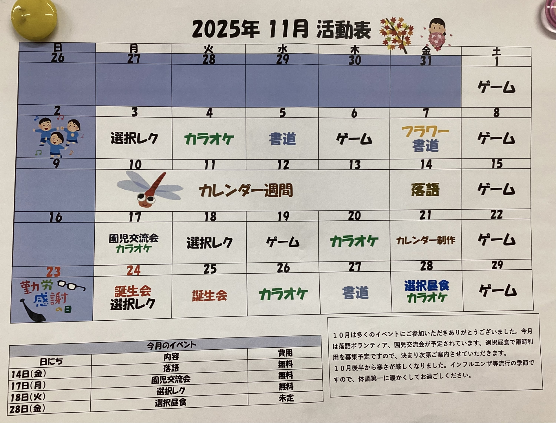 今月は久しぶりに落語が開催され、選択昼食、園児交流会等楽しい企画が多く予定されています。