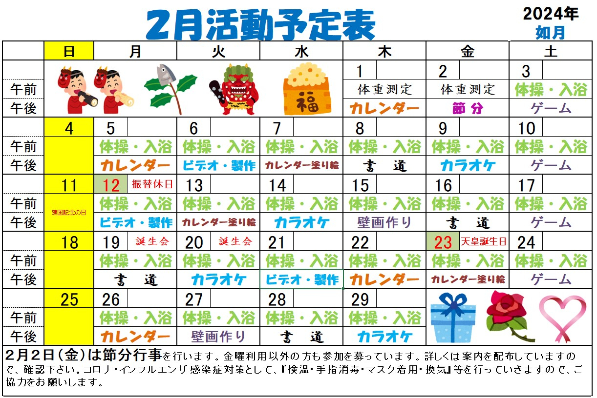 2024.01.31 お知らせ 【花の木デイ】2月予定表 Tweet シェアする 寒さが徐々に和らいできました。 2月の予定表をお知らせします。 担当 鈴木 前の記事 2024.01.31 お知らせ 【花の木デイ】2月献立表 次の記事 2024.01.31 お知らせ 【花の木デイ】お待ちかねのヘアカット♪ 一覧へ戻る