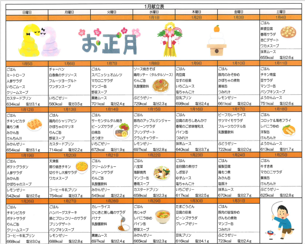 2024.12.15 活動報告 1 月の献立 Tweet シェアする 1月の献立ができました。 マイホームはるみデイサービス 飯塚 前の記事 2024.12.16 活動報告 ゲームレクリエーション 次の記事 2024.12.11 活動報告 お誕生日 一覧へ戻る