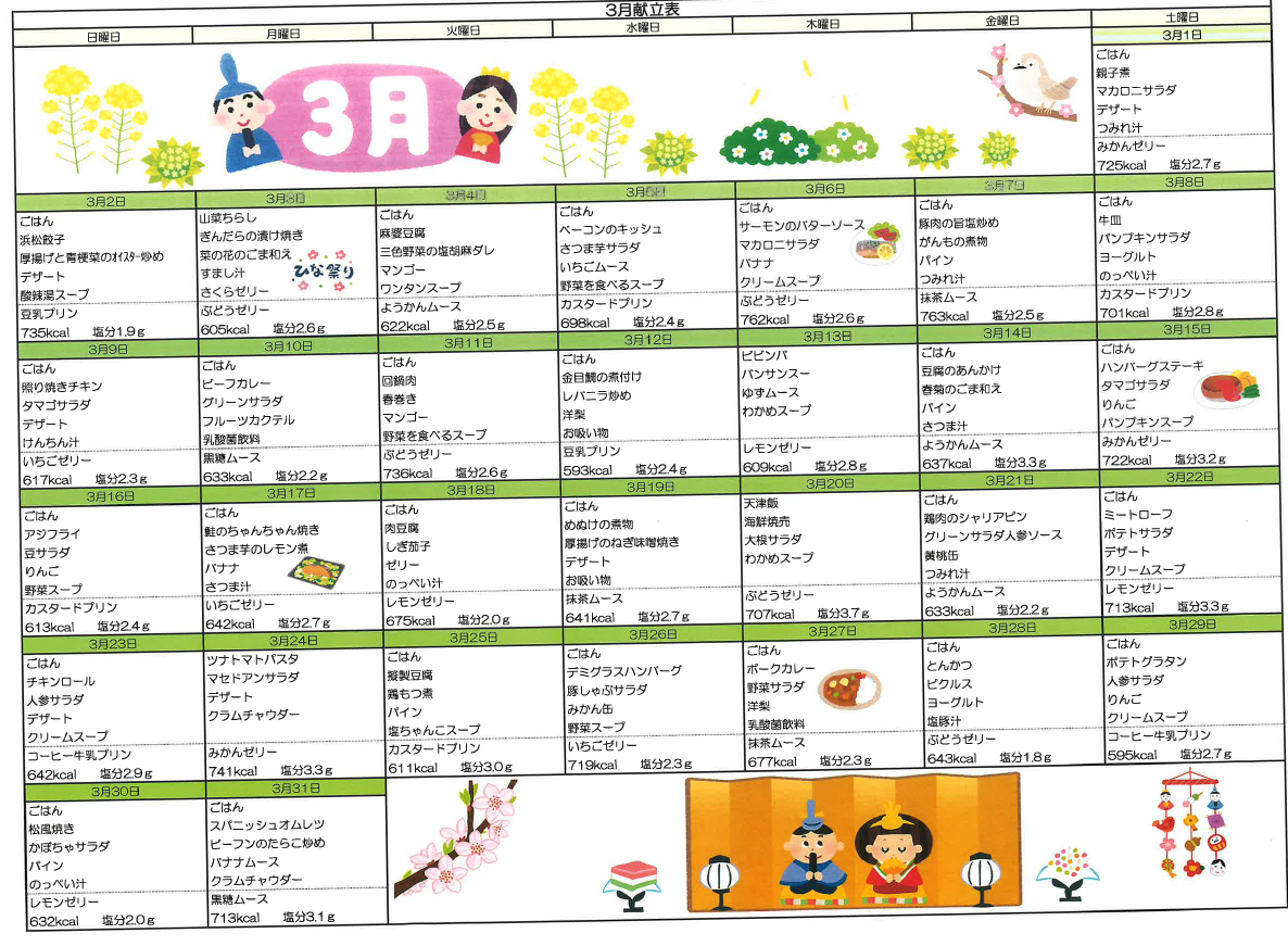 2025.02.20 活動報告 3月の献立ができました! Tweet シェアする 3月の献立ができました! 春の訪れを感じる3月。暖かくなり、旬の食材が増えてきました! マイホームはるみデイサービス 飯塚 前の記事 2025.02.21 活動報告 踊 次の記事 2025.02.18 活動報告 ロータリークラブさんにお越し頂きました♪ 一覧へ戻る