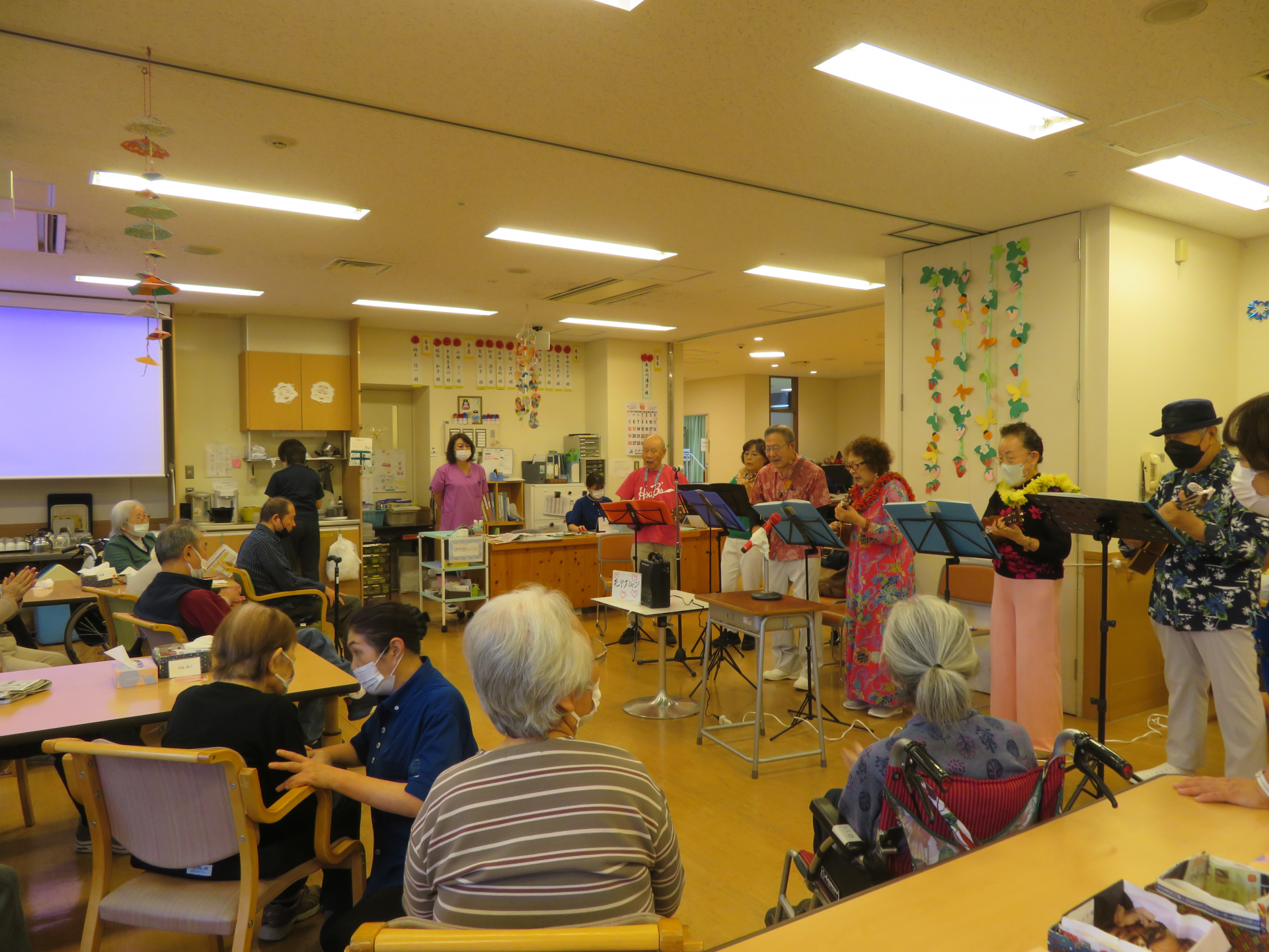 2025.10.28 活動報告 モアナムーン Tweet シェアする 本日はハワイアン風のボランティアさんが来て下さり、懐かしい曲や機器なじみのある曲を演奏して下さいました。 利用者様も一緒に口ずさみながら、和やかな時間を過ごされました。 マイホームはるみデイサービス 飯塚 前の記事 2025.10.29 活動報告 腿上げ動作で躓き軽減を 次の記事 2025.10.24 活動報告 腰が痛い方へ 一覧へ戻る