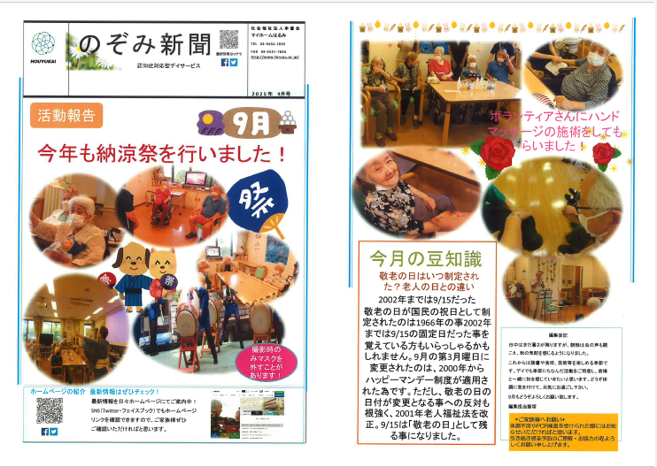 2025.08.23 活動報告 9月ののぞみ新聞 Tweet シェアする 9月の新聞ができました! 皆様ぜひご一読お願いします。 マイホームはるみ認知デイ 飯塚 前の記事 2025.08.27 活動報告 踊りの会 次の記事 2025.08.23 活動報告 9月の献立 一覧へ戻る
