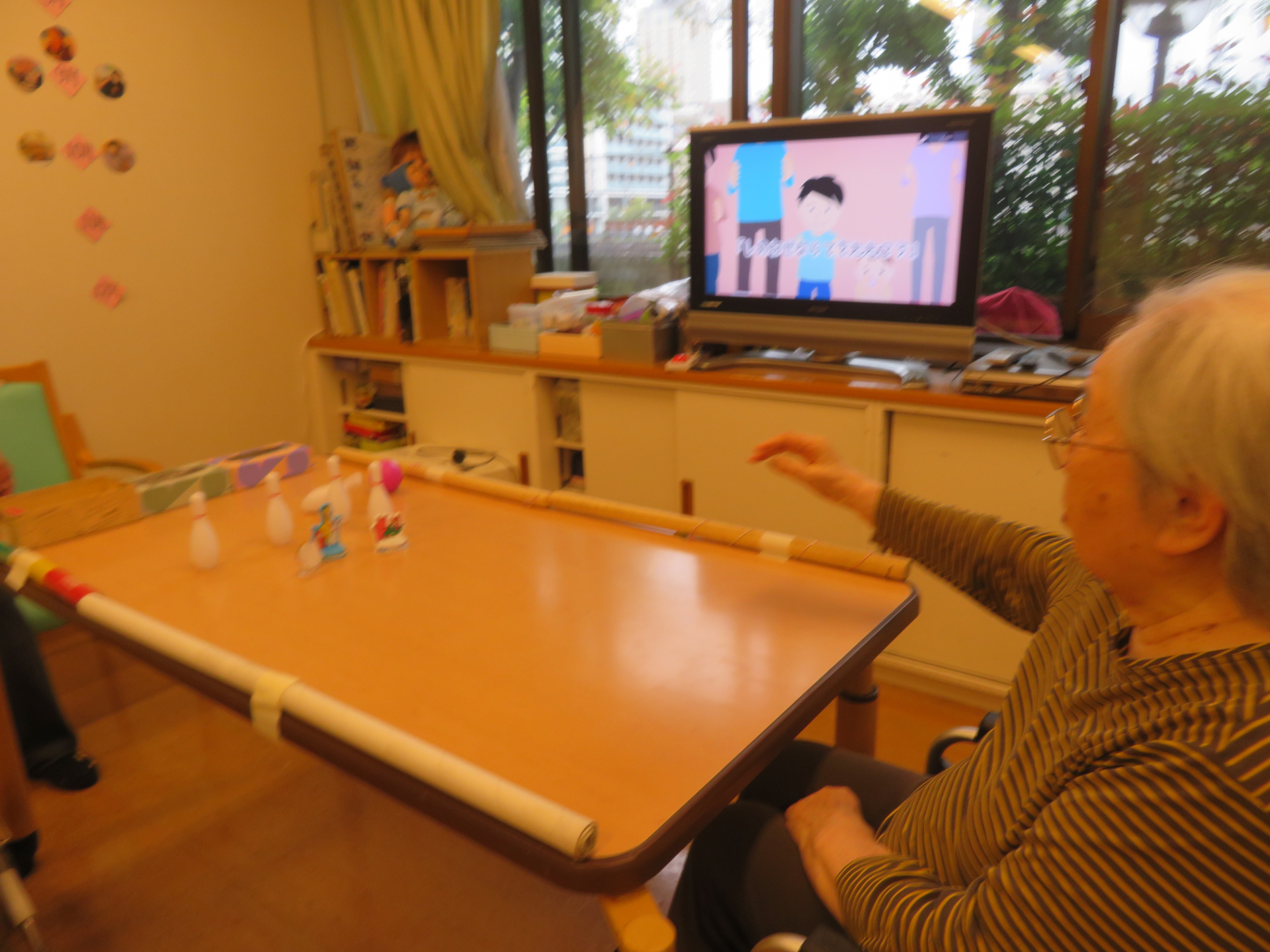 今日のレクリエーションでは、ボールを使ってボウリングをしたり、ペットボトルキャップを拾うゲームを行いました。