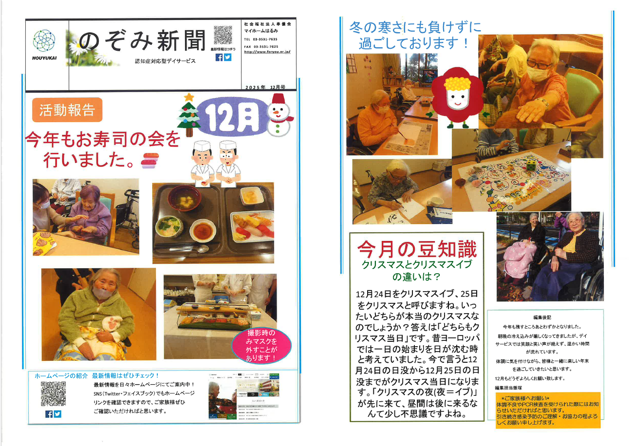 2025.11.22 活動報告(IN) 12月の新聞が出来ました。 Tweet シェアする 12月の新聞が出来ました! 皆様ぜひご一読下さい。 マイホームはるみ認知デイ 飯塚 前の記事 2025.11.27 活動報告(IN) セラピードッグ 次の記事 2025.11.21 活動報告(IN) 踊りの会 一覧へ戻る