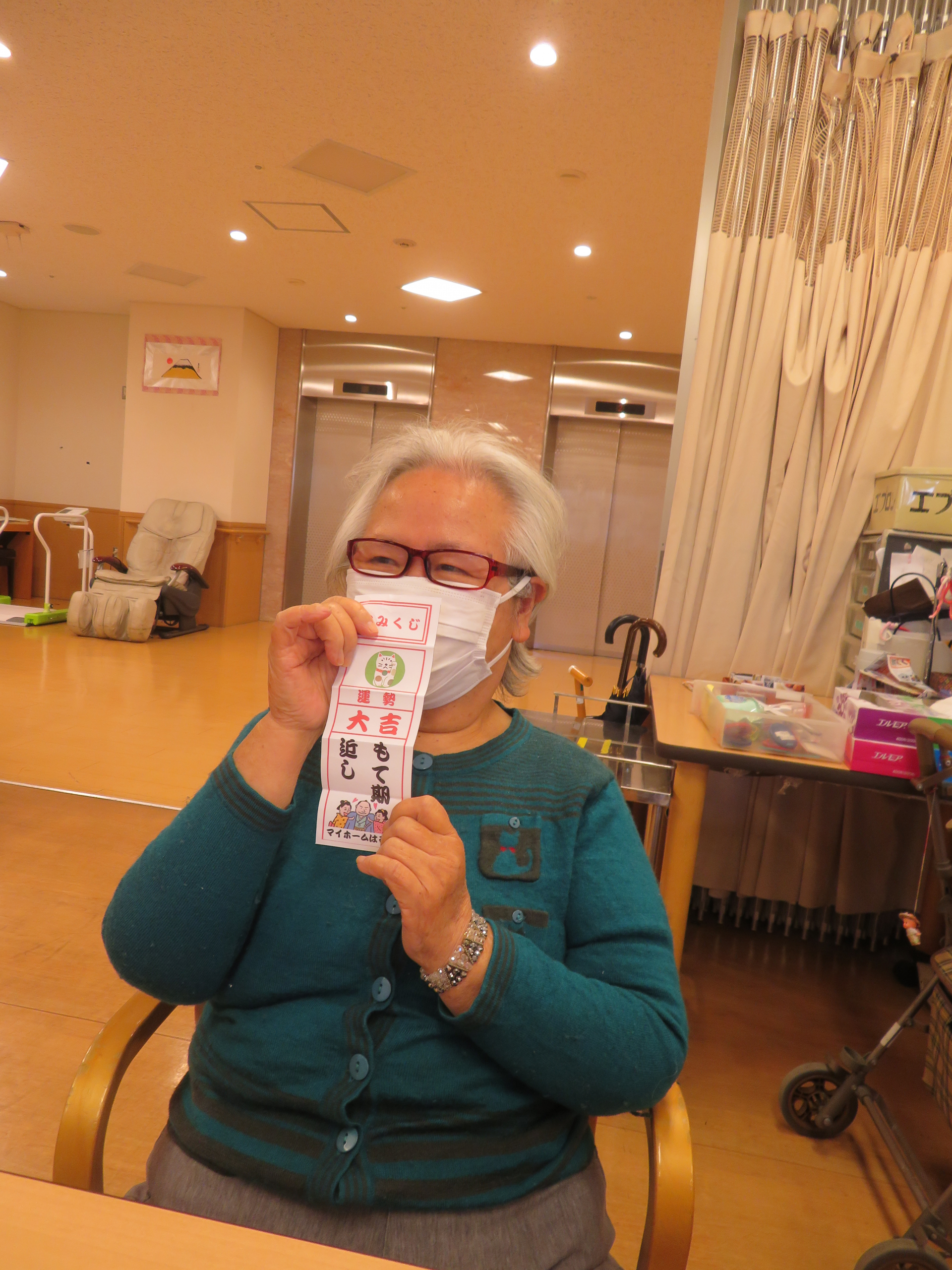 今年最初のレクリエーションでは、職員手作りの神社で参拝を行い、その後、手作りのおみくじ引いて頂きました。