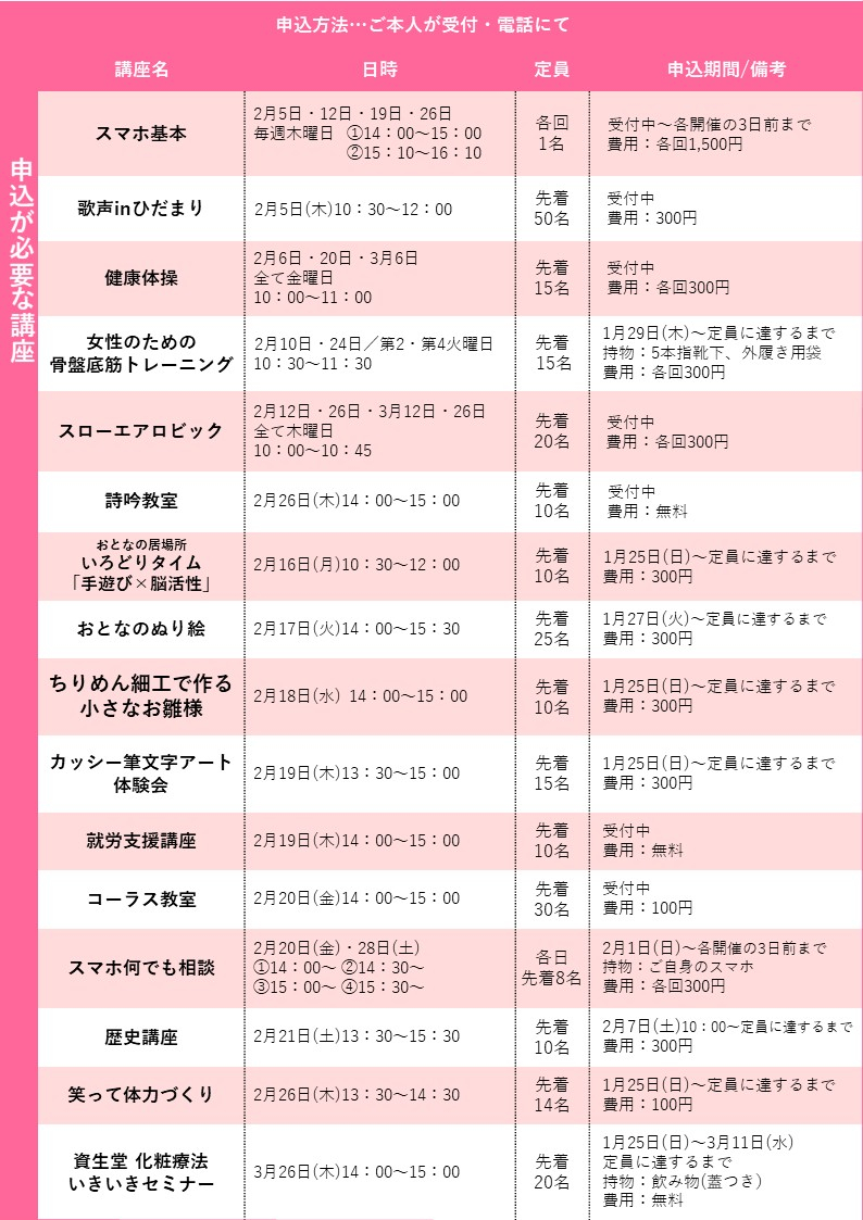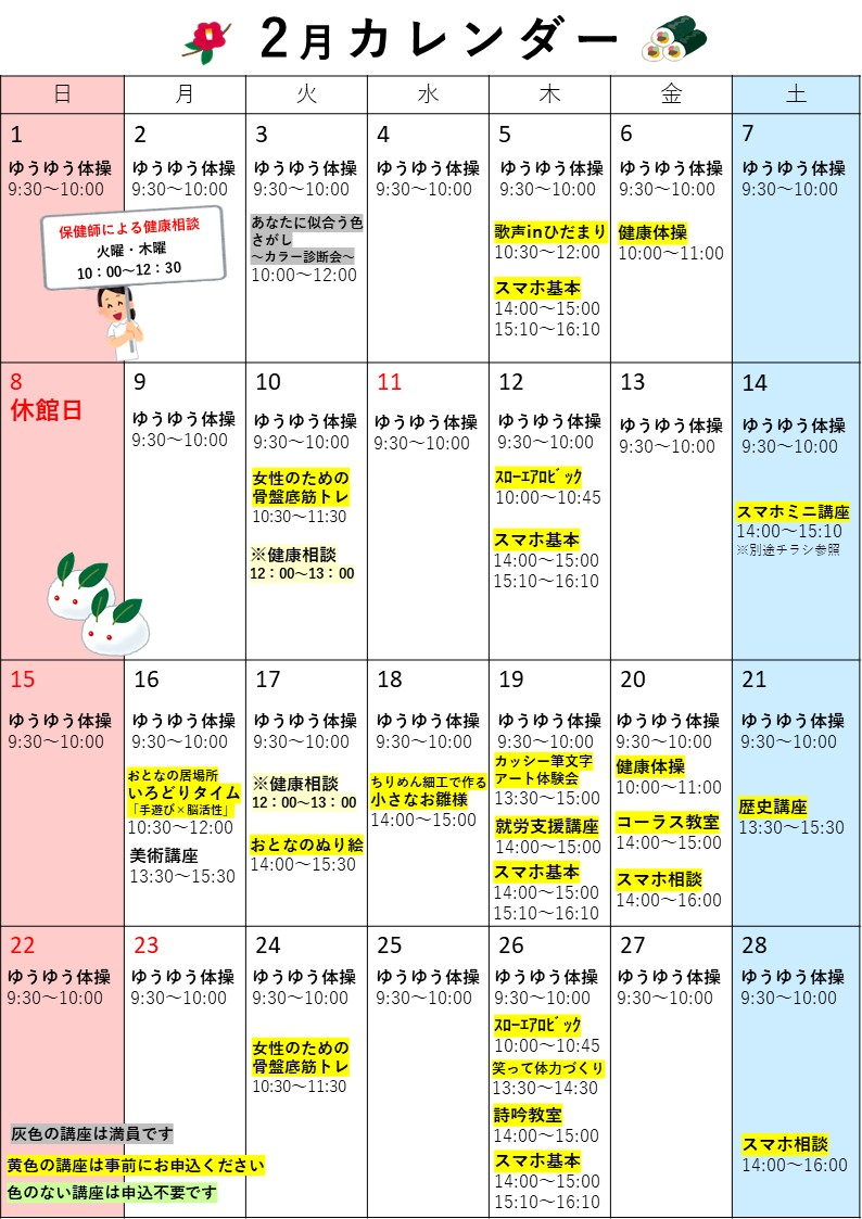 2月は「筆文字アート」「ちりめん細工で作る小さなお雛様」を開催予定です。