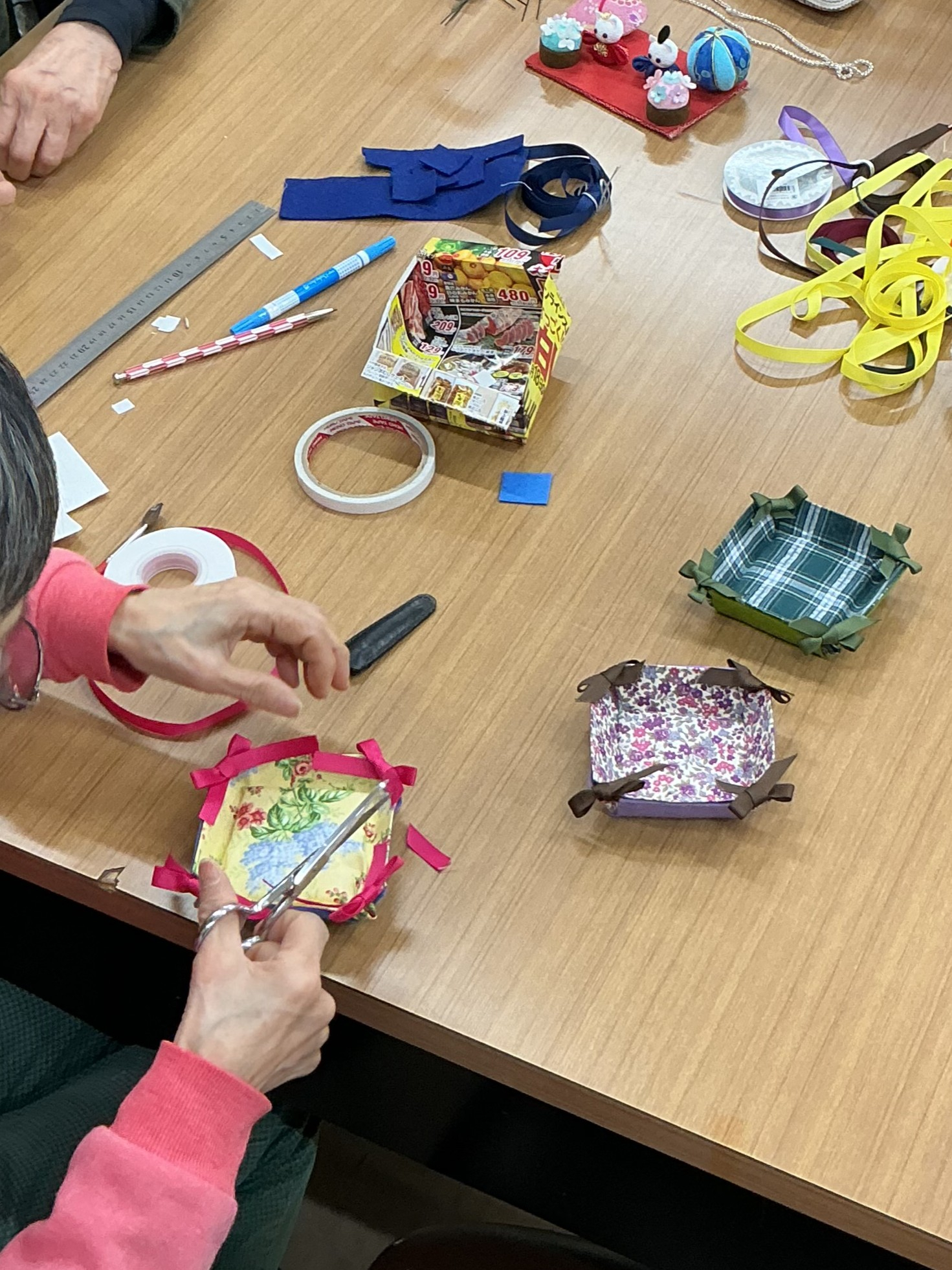 各々布やリボンを使って色とりどりの可愛らしいトレイを作成しました!!