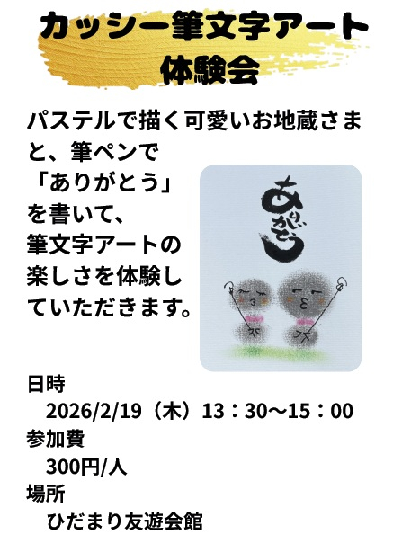 2026.01.31 お知らせ 筆文字アートを体験してみませんか♪ Tweet シェアする 2月19日(木)に「筆文字アート」を開催します! かわいいお地蔵さん+ありがとうの文字を描きましょう♪ お気軽にお問合せください! ひだまり友遊会館 cs 前の記事 2026.01.31 お知らせ 就労支援講座 次の記事 2026.01.30 お知らせ ひだまり粘土教室 一覧へ戻る