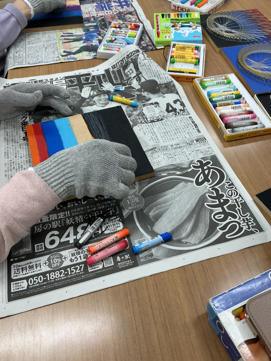 クレヨンで板に色を塗り、ティッシュや軍手を使ってこすりグラデーションにしていきます。