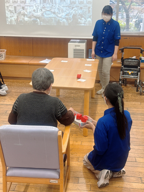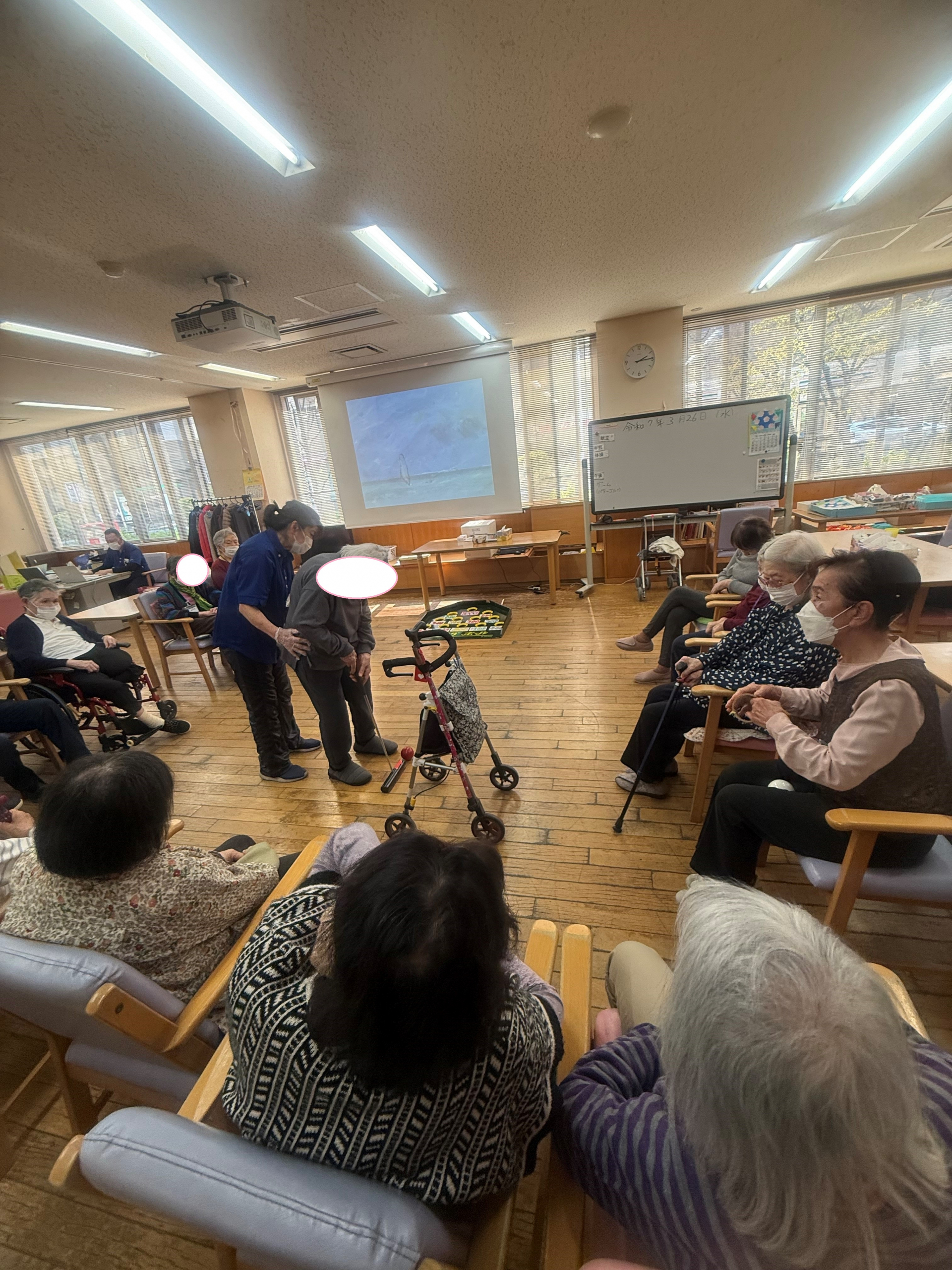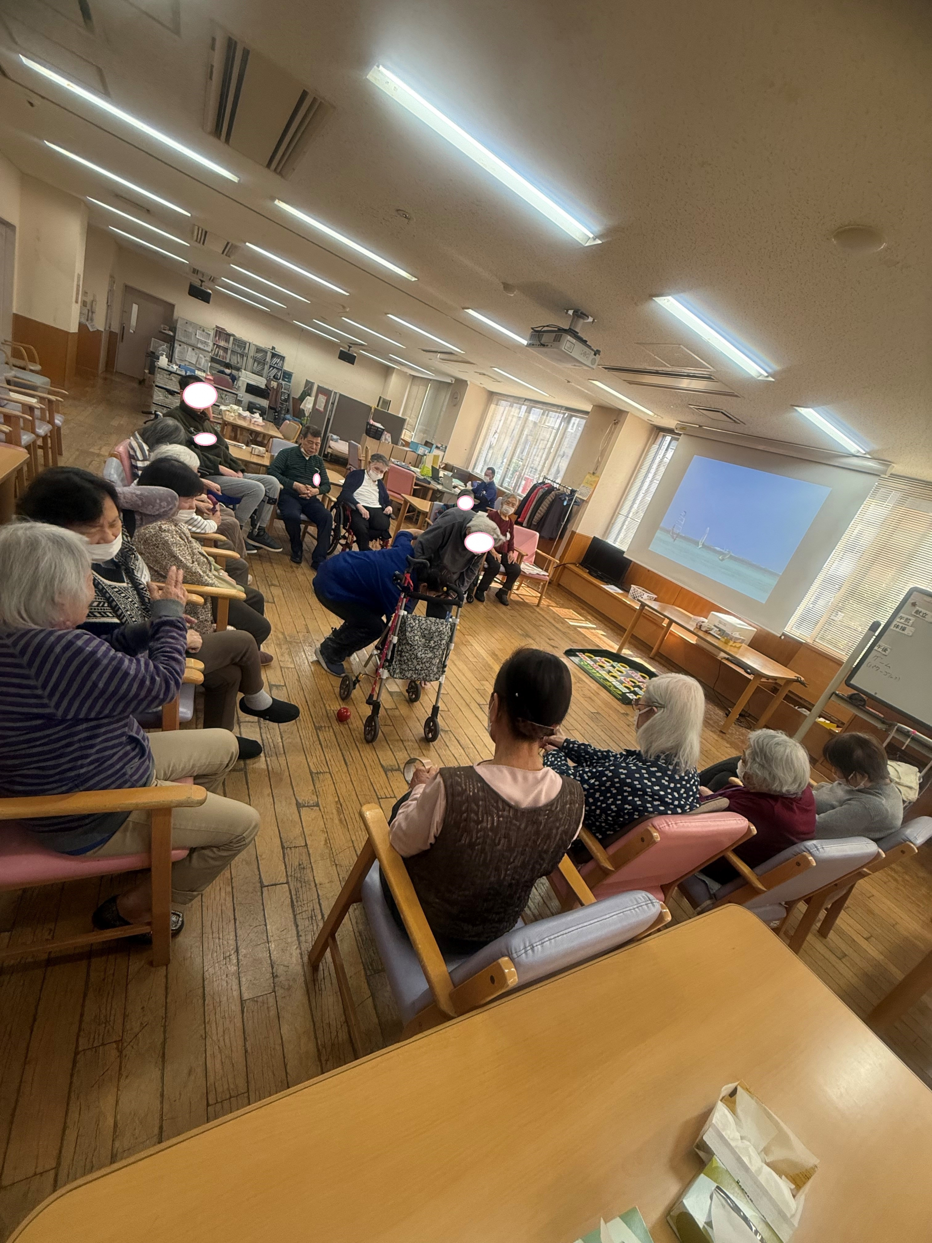 今日は「パターゴルフ」でお楽しみいただけました。ゲートボールのスティックや本物のゴルフパターを使って、玉を転がし点数を競いました。高得点の穴に入ったら歓声が上がっていましたよ^-^