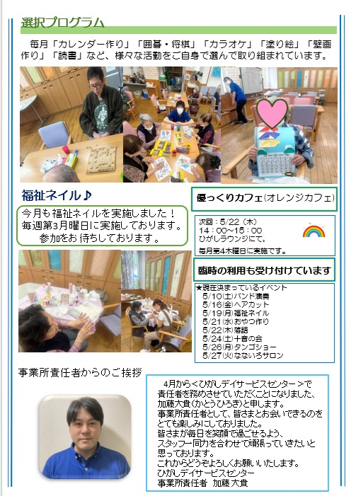 今月より新しい事業所責任者の加藤が、ひがしデイに仲間入りをしました。