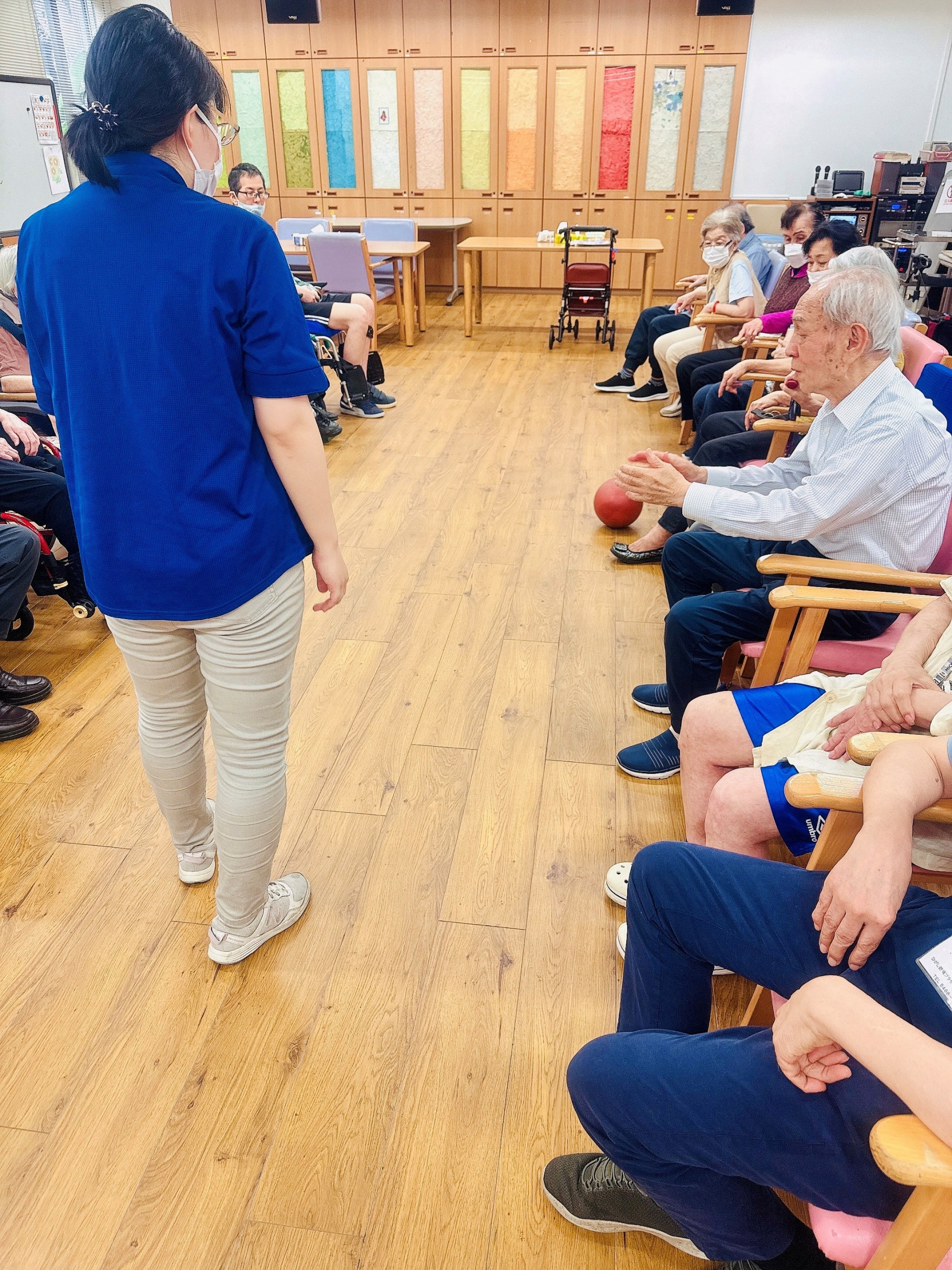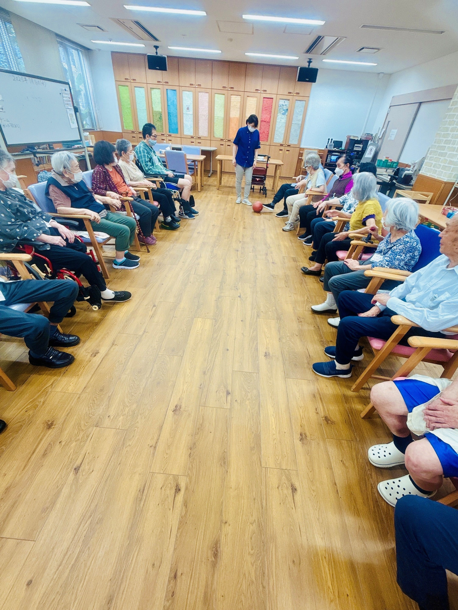 今日は「ボール飛ばしゲーム」で、足の運動を兼ねてお楽しみいただきました。足でボールを蹴って、カゴの中に上手くボールを入れます。普段とは違う足の動きをしますが、皆さま意外と上手にされていました。