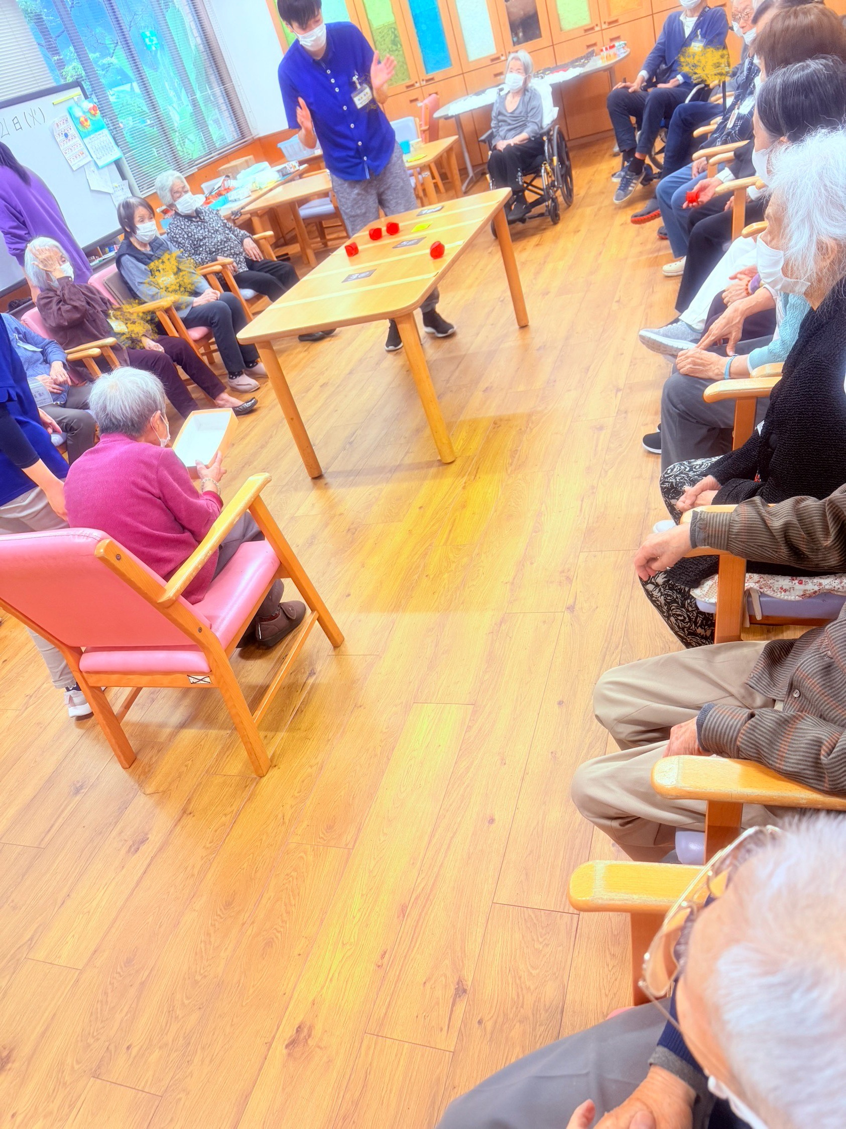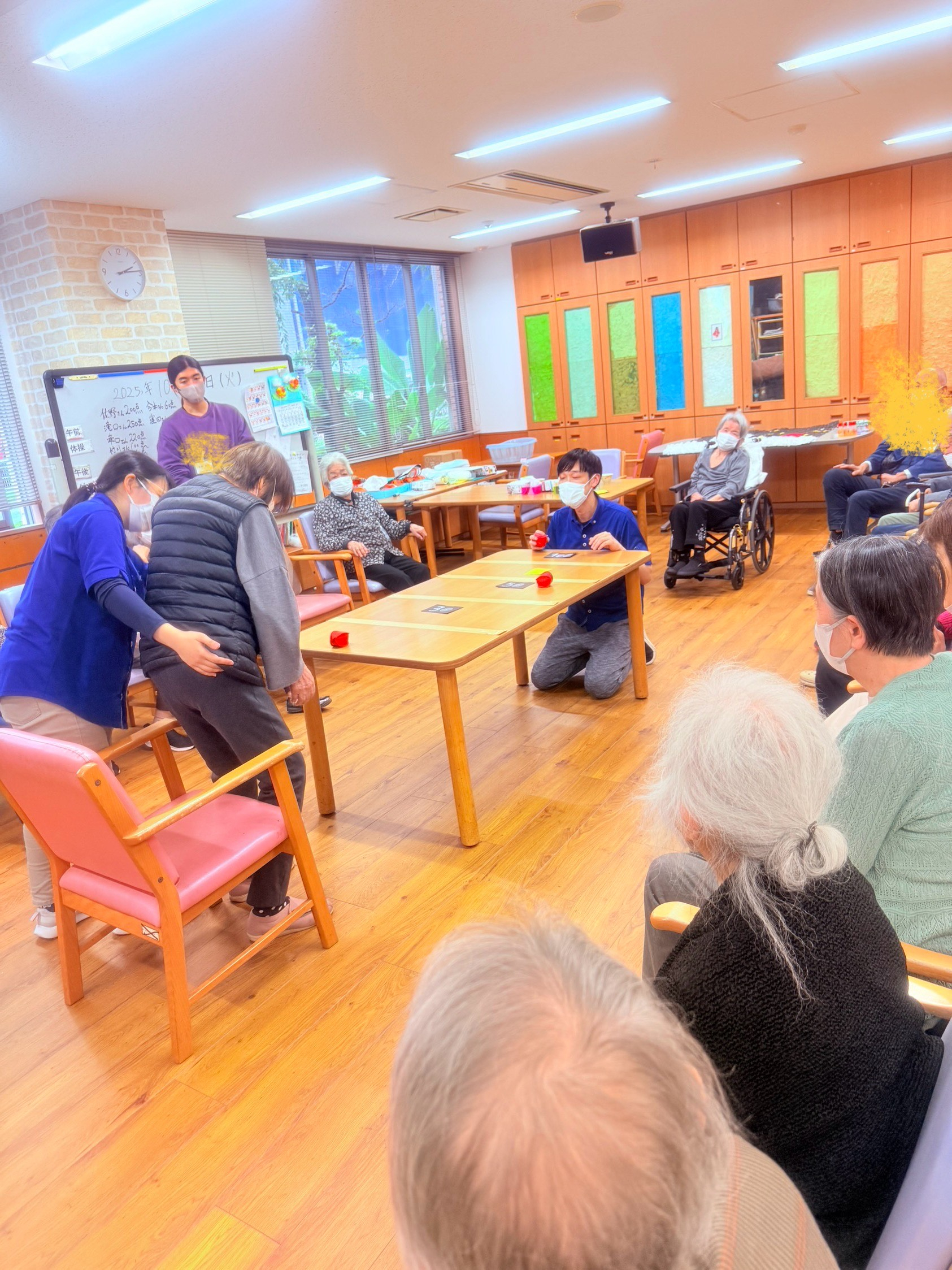 2025.10.21 活動報告 ゲーム(テーブルのせ) Tweet シェアする 今日はテーブルのせゲームを実施しました。ボールを5個投げ、合計得点が高くなるように皆さん頑張りました。 ひがしデイのゴーテイモ 前の記事 2025.10.23 活動報告 傘で玉入れゲーム 次の記事 2025.10.20 活動報告 ネイルサロン 一覧へ戻る