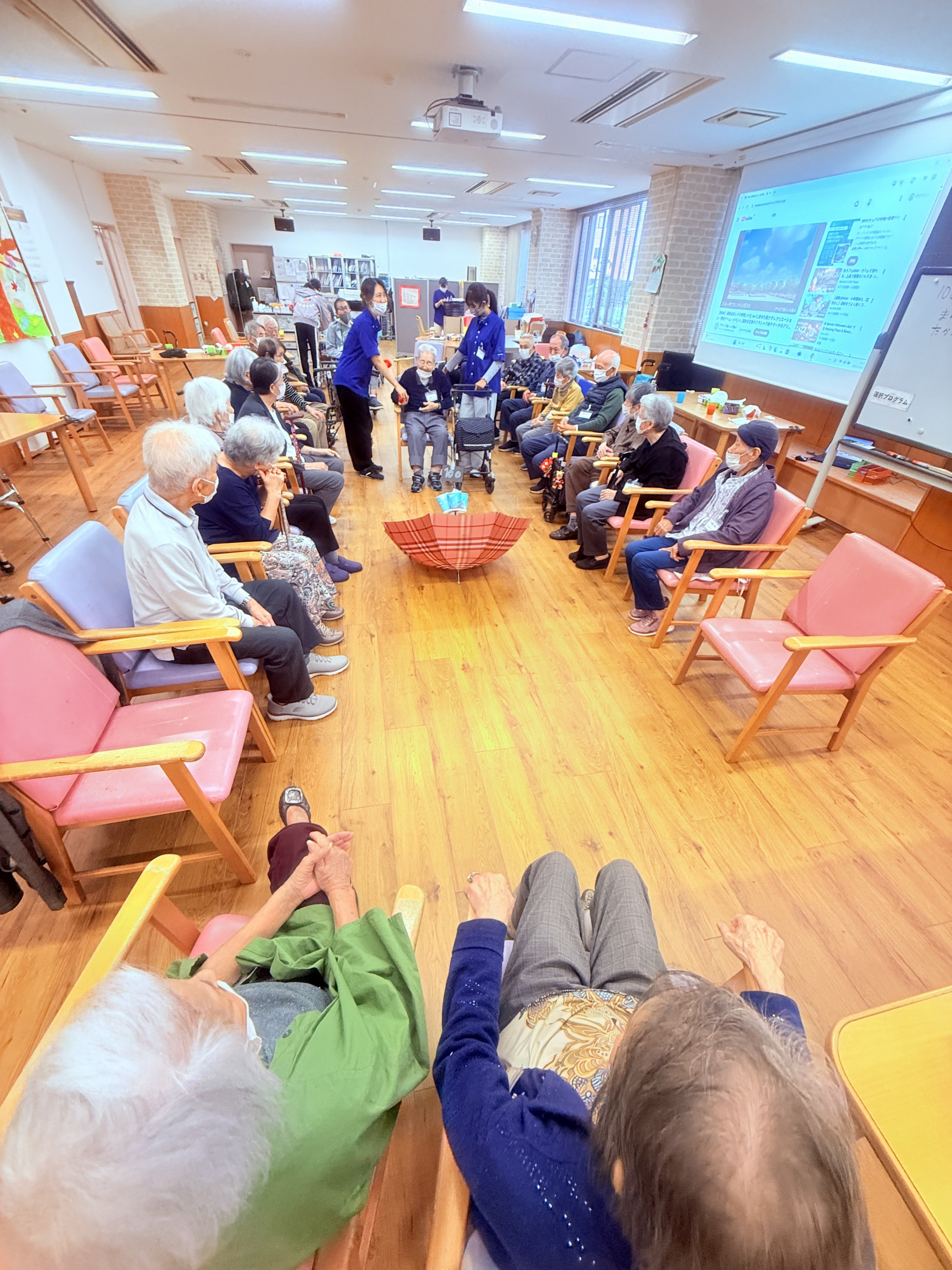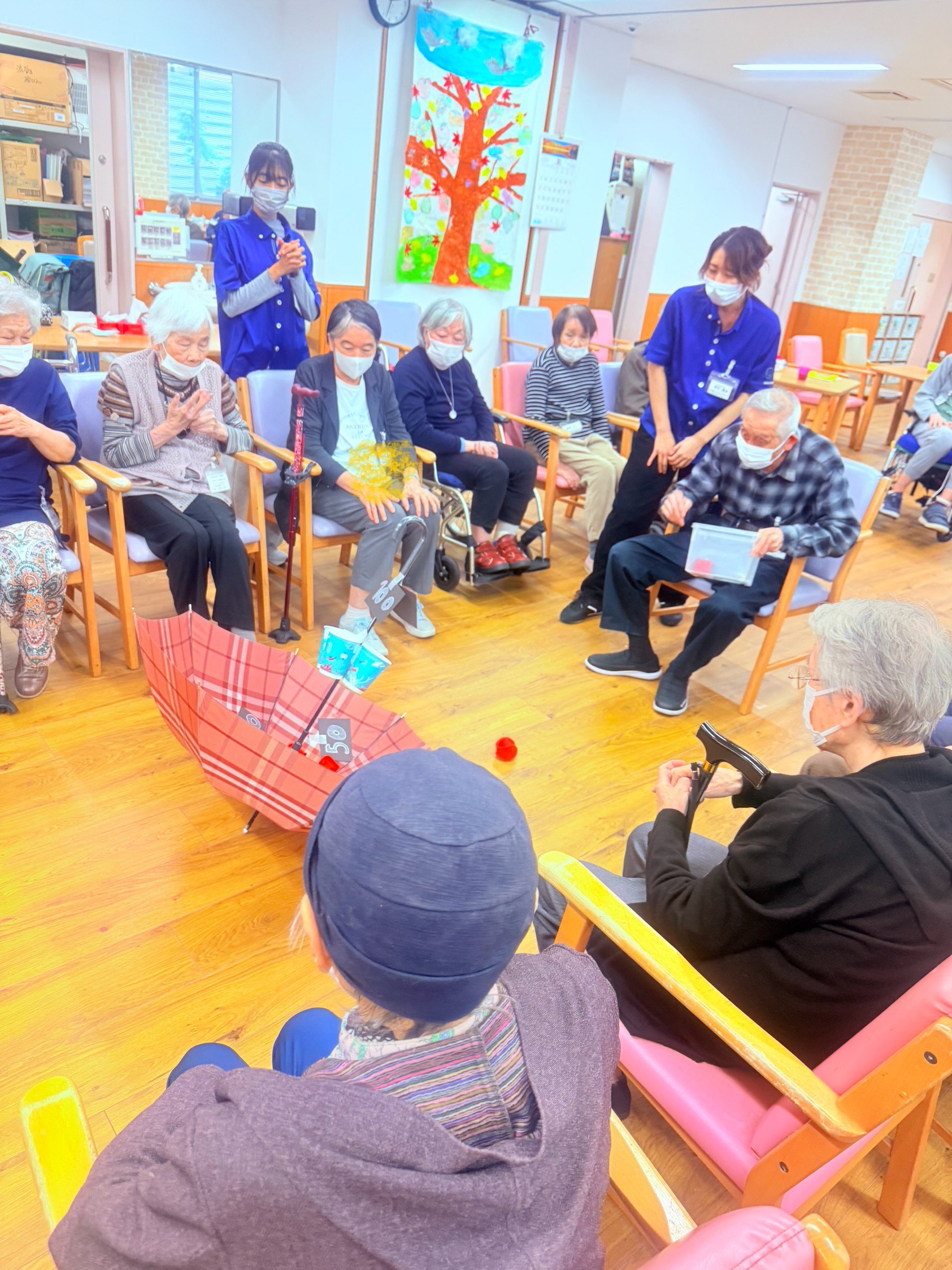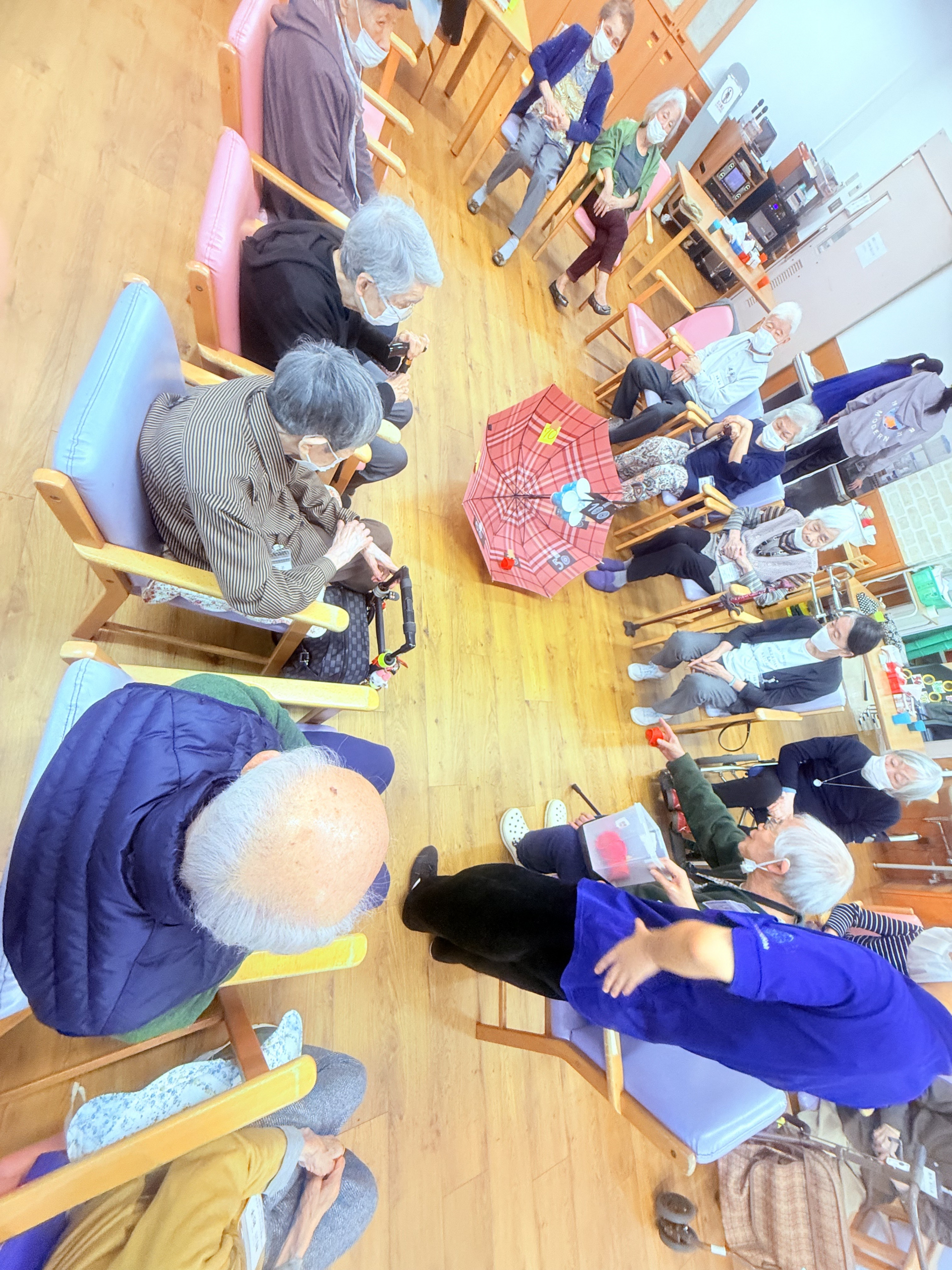2025.10.23 活動報告 傘で玉入れゲーム Tweet シェアする 今日は傘雨ゲームを実施しました。傘の中にある紙コップに、ボールが入ると高得点になります。合計得点が高くなるように頑張りました。皆様の声援により、とても盛り上がりました^~^ ひがしデイのゴーティモ 前の記事 2025.10.24 活動報告 運動会 次の記事 2025.10.21 活動報告 ゲーム(テーブルのせ) 一覧へ戻る