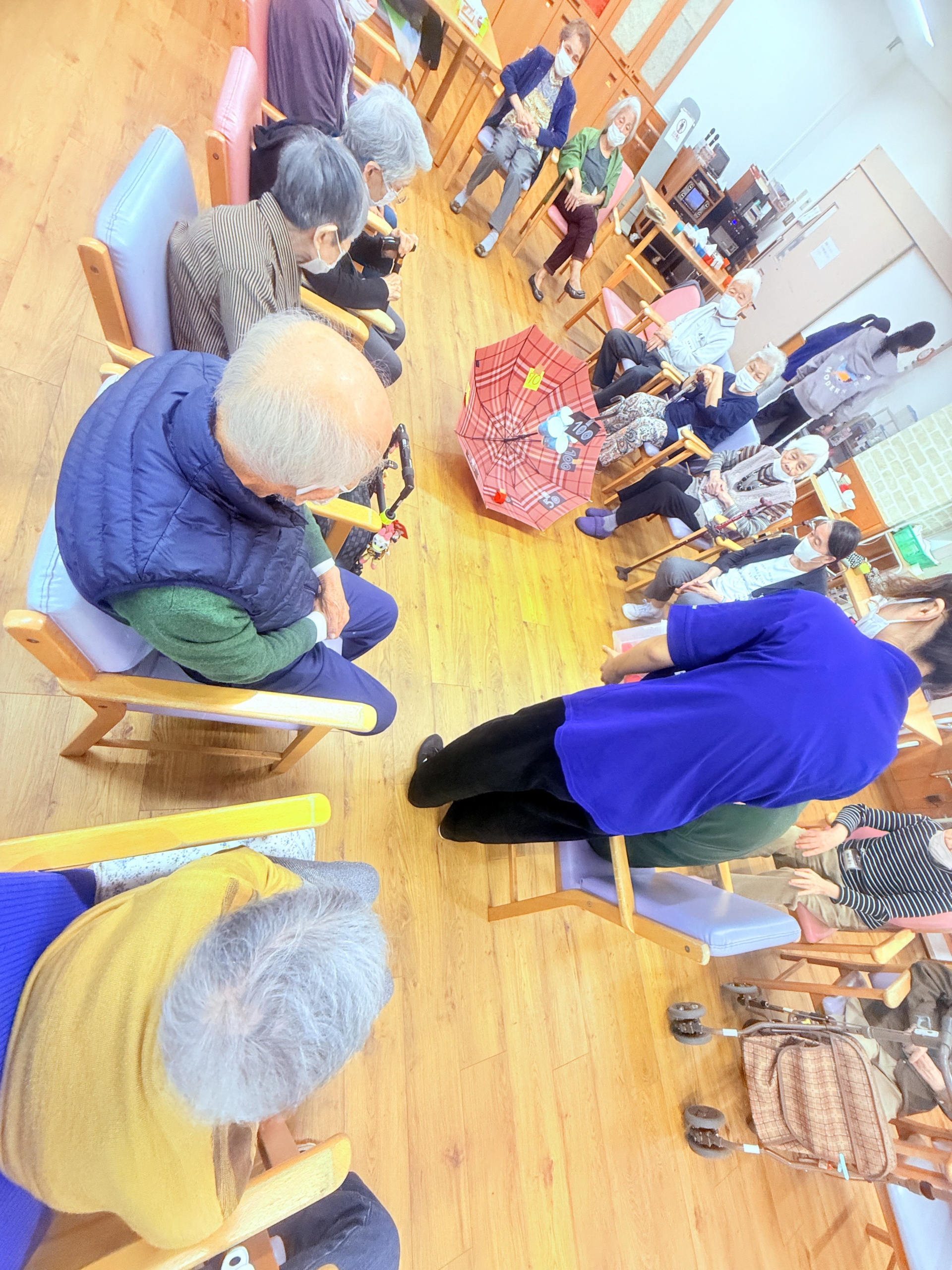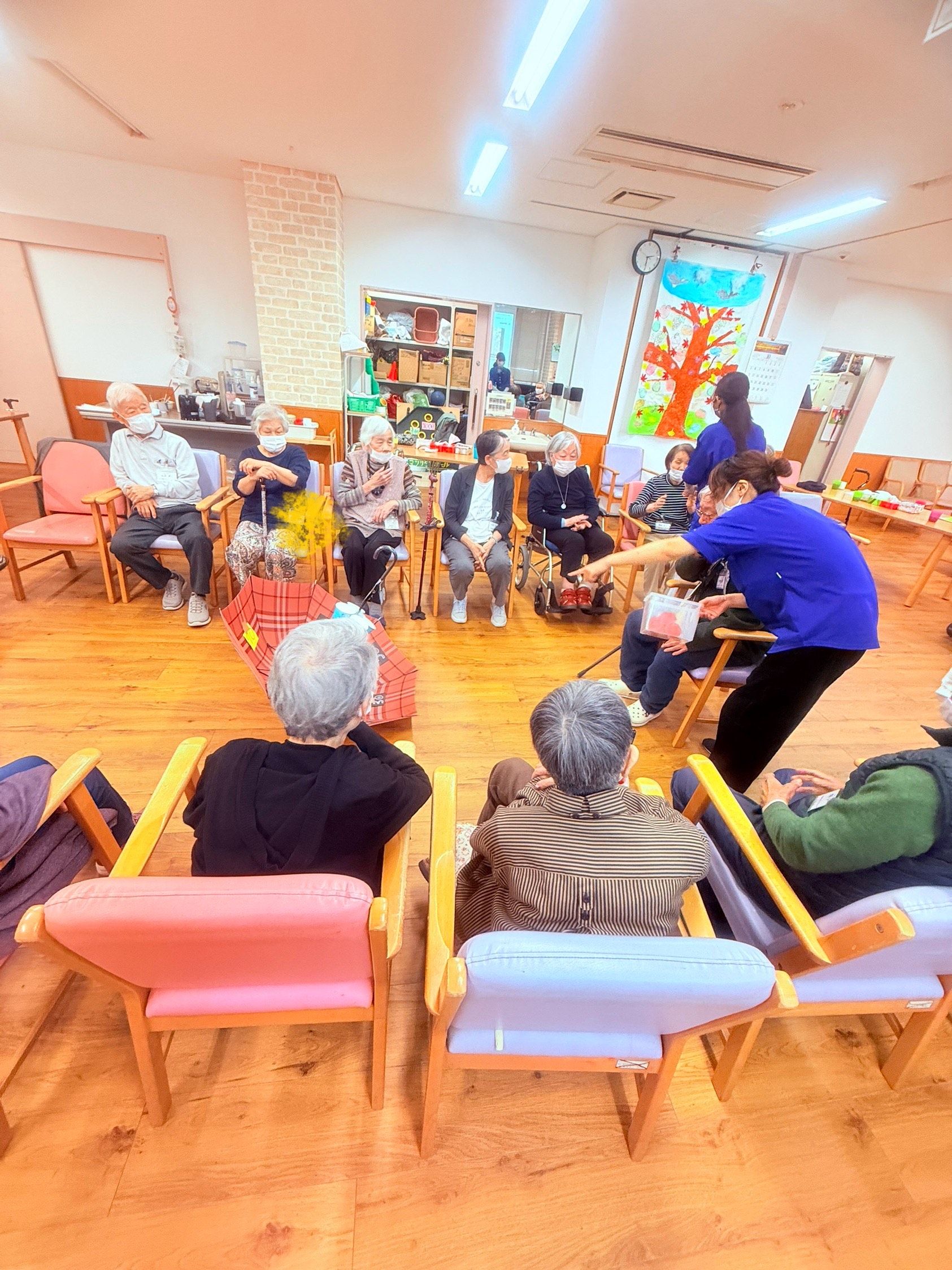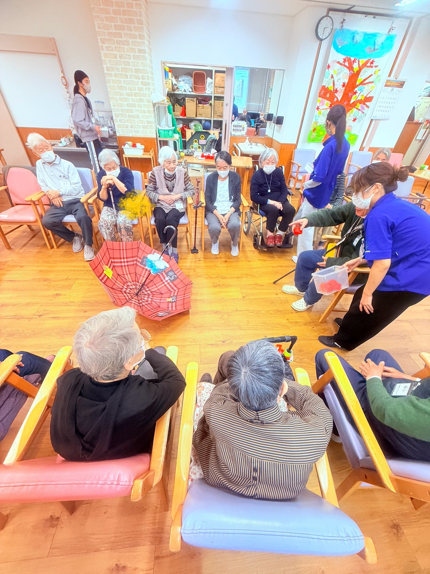 2025.10.23 活動報告 傘で玉入れゲーム Tweet シェアする 今日は傘雨ゲームを実施しました。傘の中にある紙コップに、ボールが入ると高得点になります。合計得点が高くなるように頑張りました。皆様の声援により、とても盛り上がりました^~^ ひがしデイのゴーティモ 前の記事 2025.10.24 活動報告 運動会 次の記事 2025.10.21 活動報告 ゲーム(テーブルのせ) 一覧へ戻る
