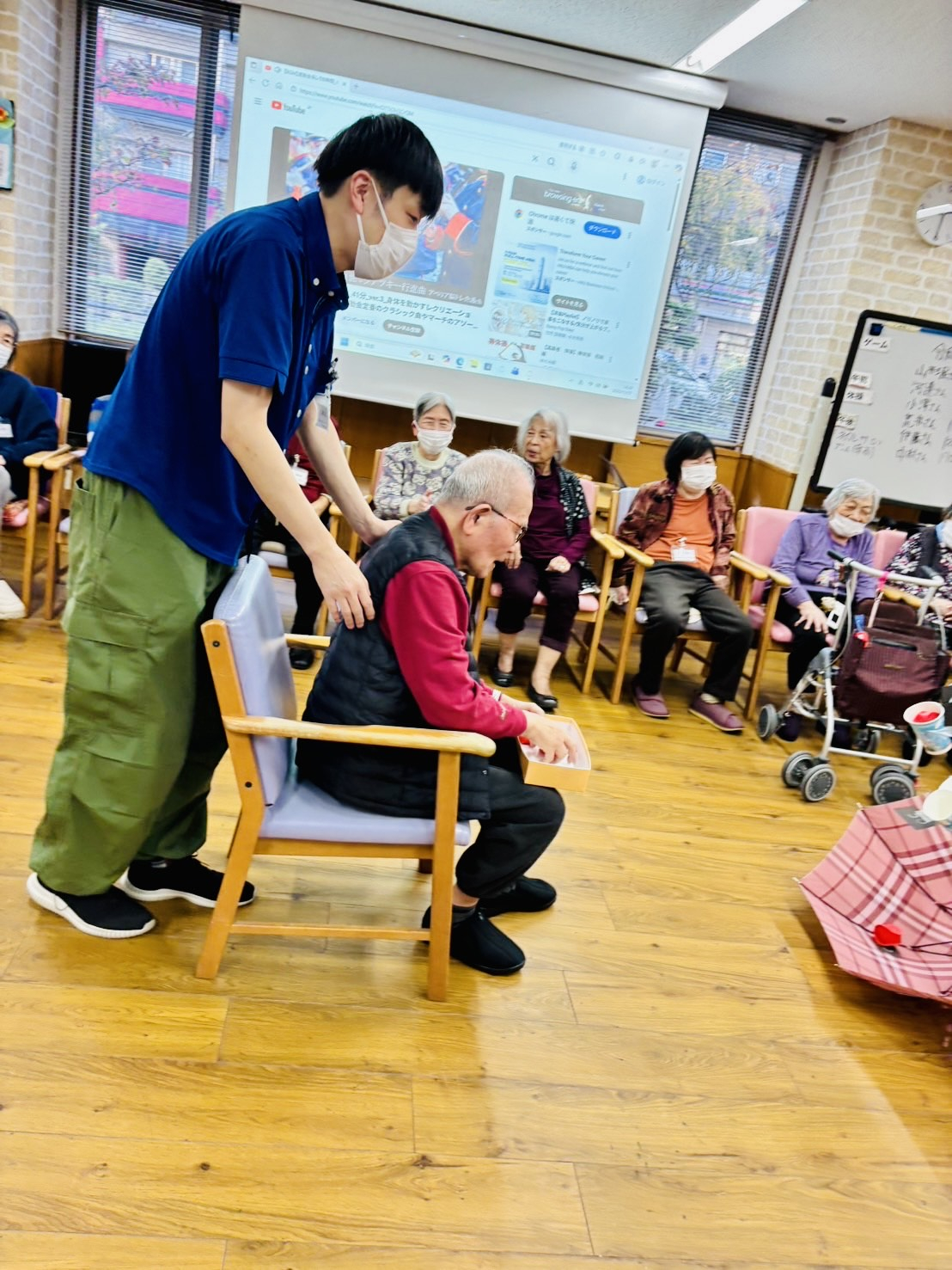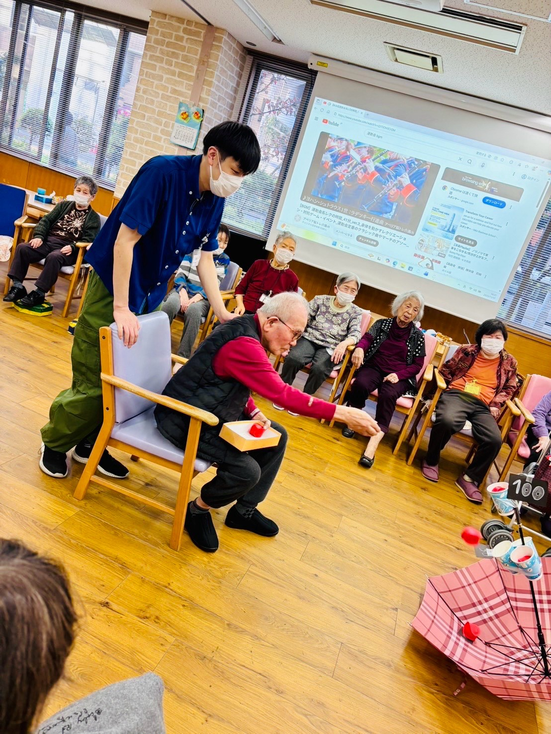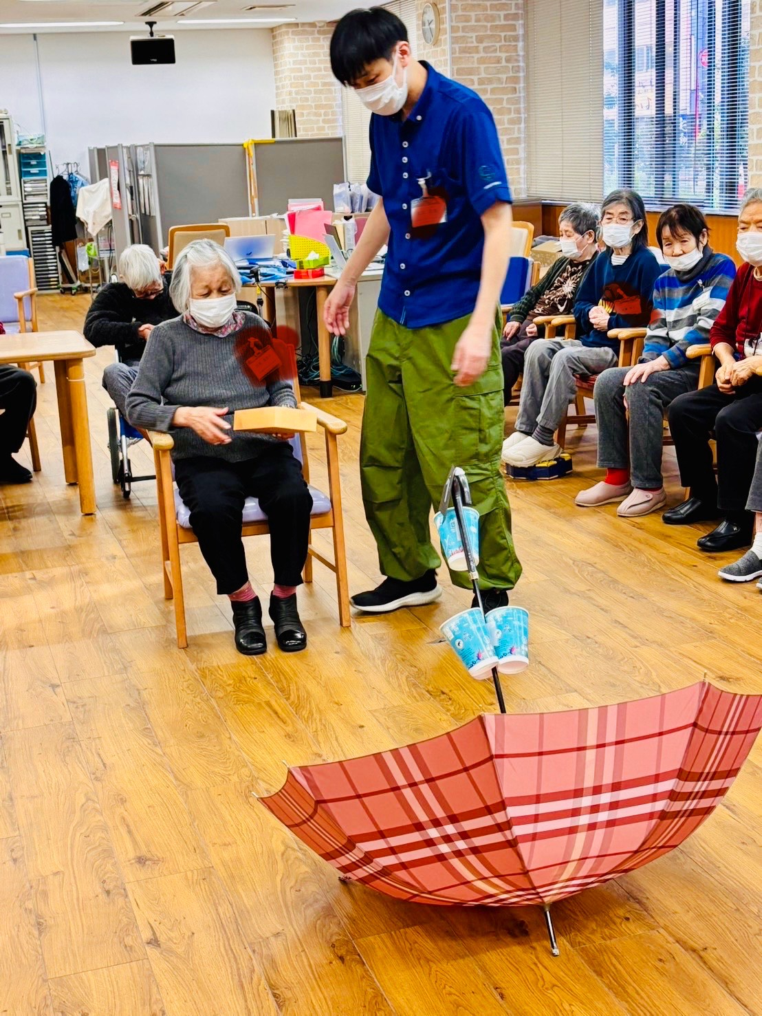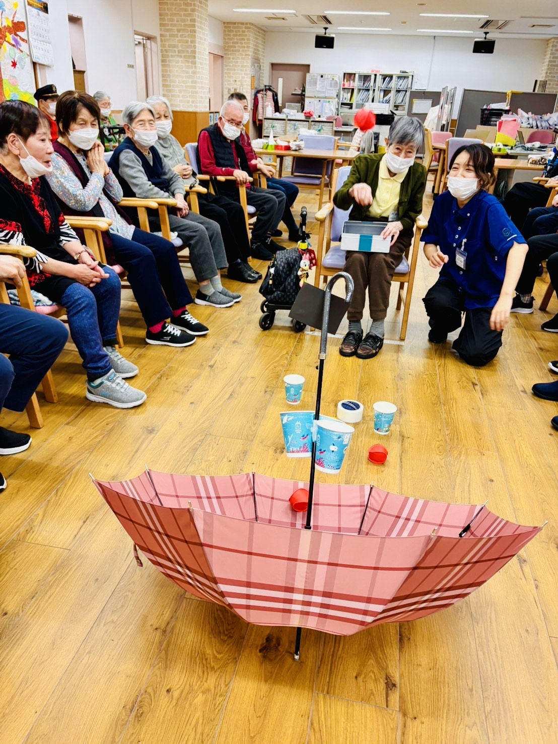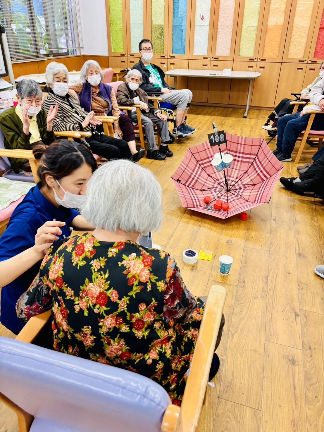 2025.11.17 活動報告 傘雨ゲーム Tweet シェアする 本日は傘雨ゲームを実施しました。傘の持ち手についている紙コップにボールが入るように皆さん頑張っており、盛り上がりました。 ひがしデイのゴーテイモ 前の記事 2025.11.19 活動報告 ゲーム(風船バレー) 次の記事 2025.11.17 活動報告 ネイルイサロン 一覧へ戻る