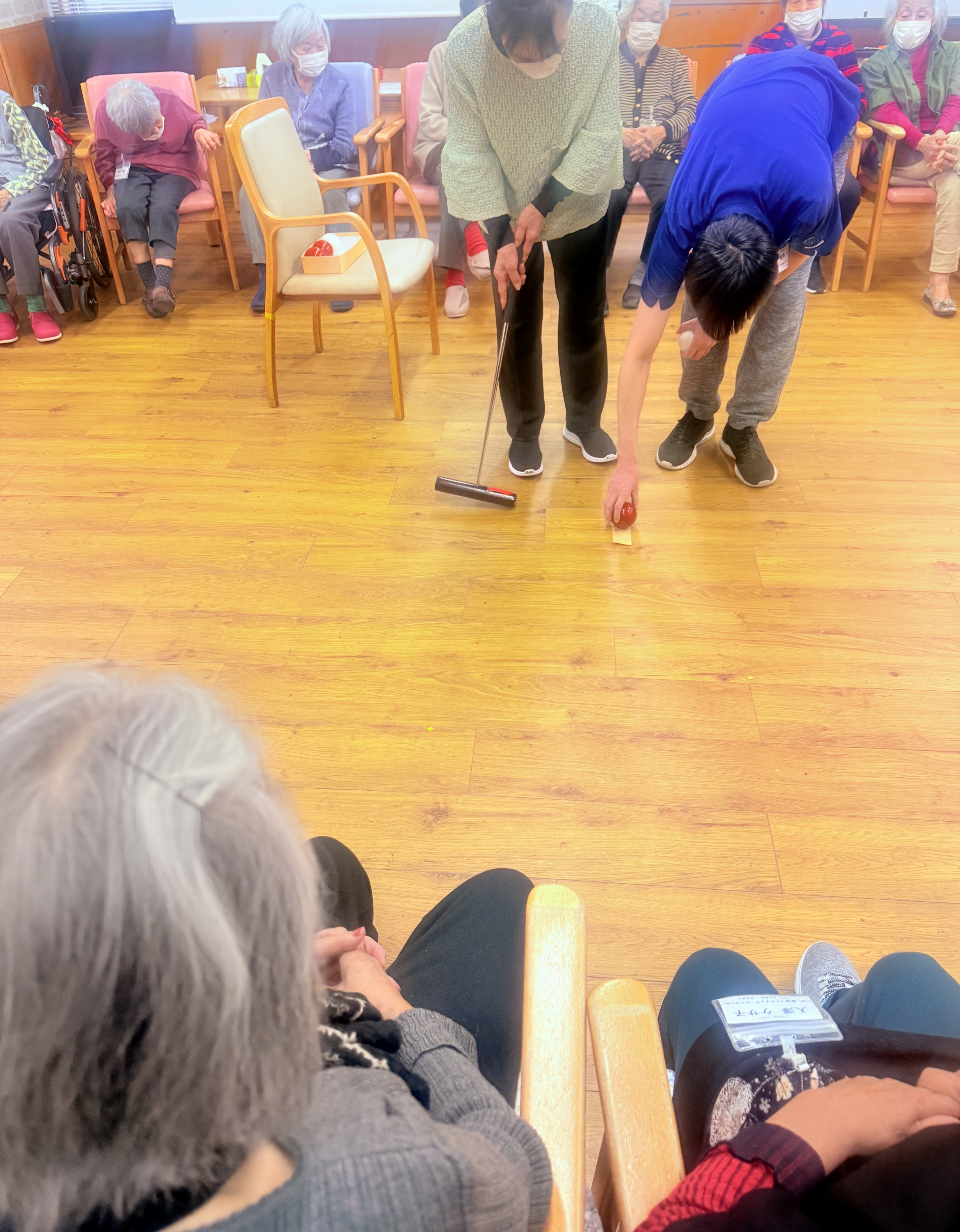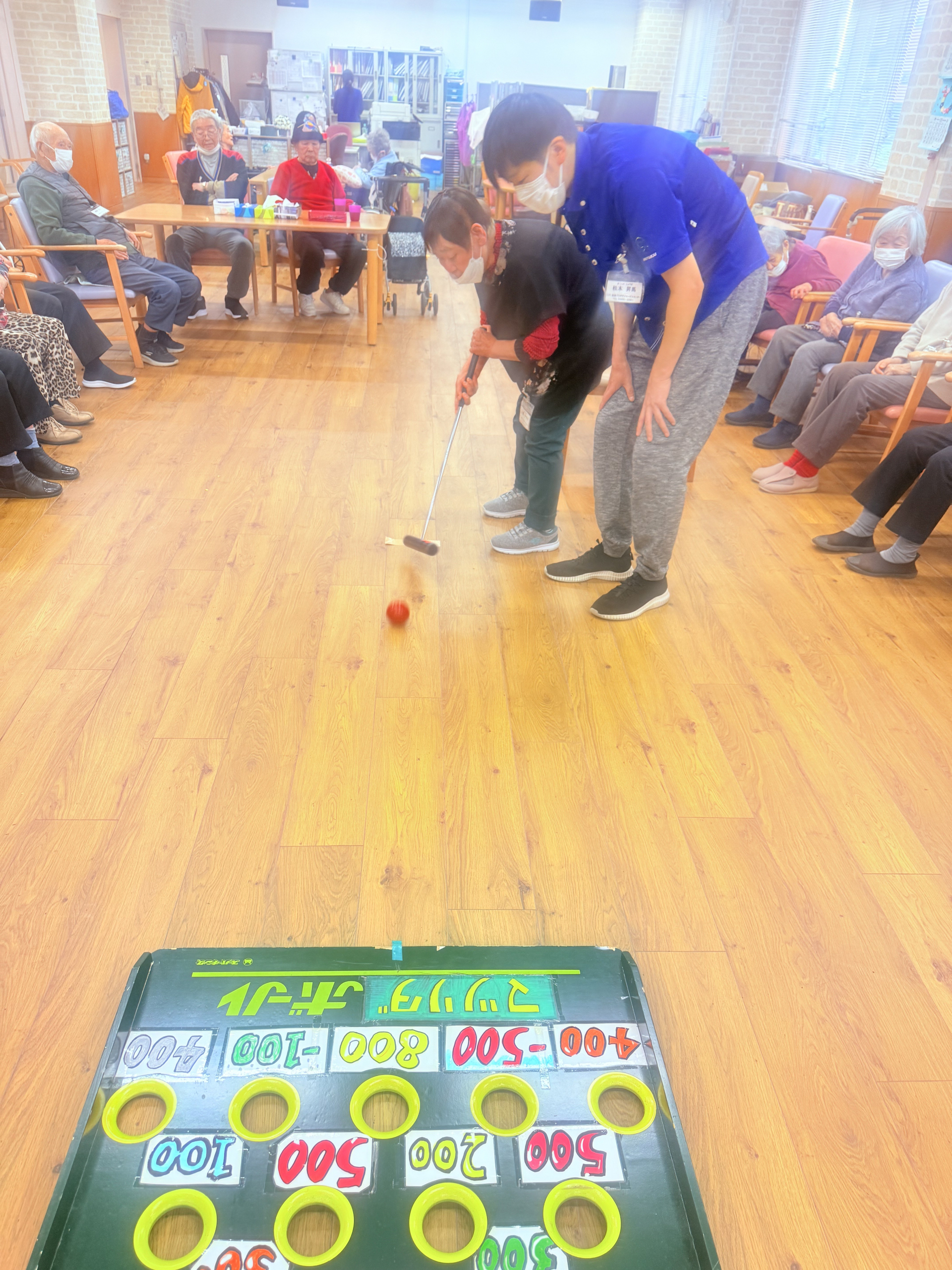 本日はご利用者様がパターゴルフゲームを実施しました。ボールを転がして点数が書いてある箇所に入れるゲームです。狙った所に入れることは、難しい様子でした。点数が入ると盛り上がっておりました。皆様の声援により盛り上がりました。
