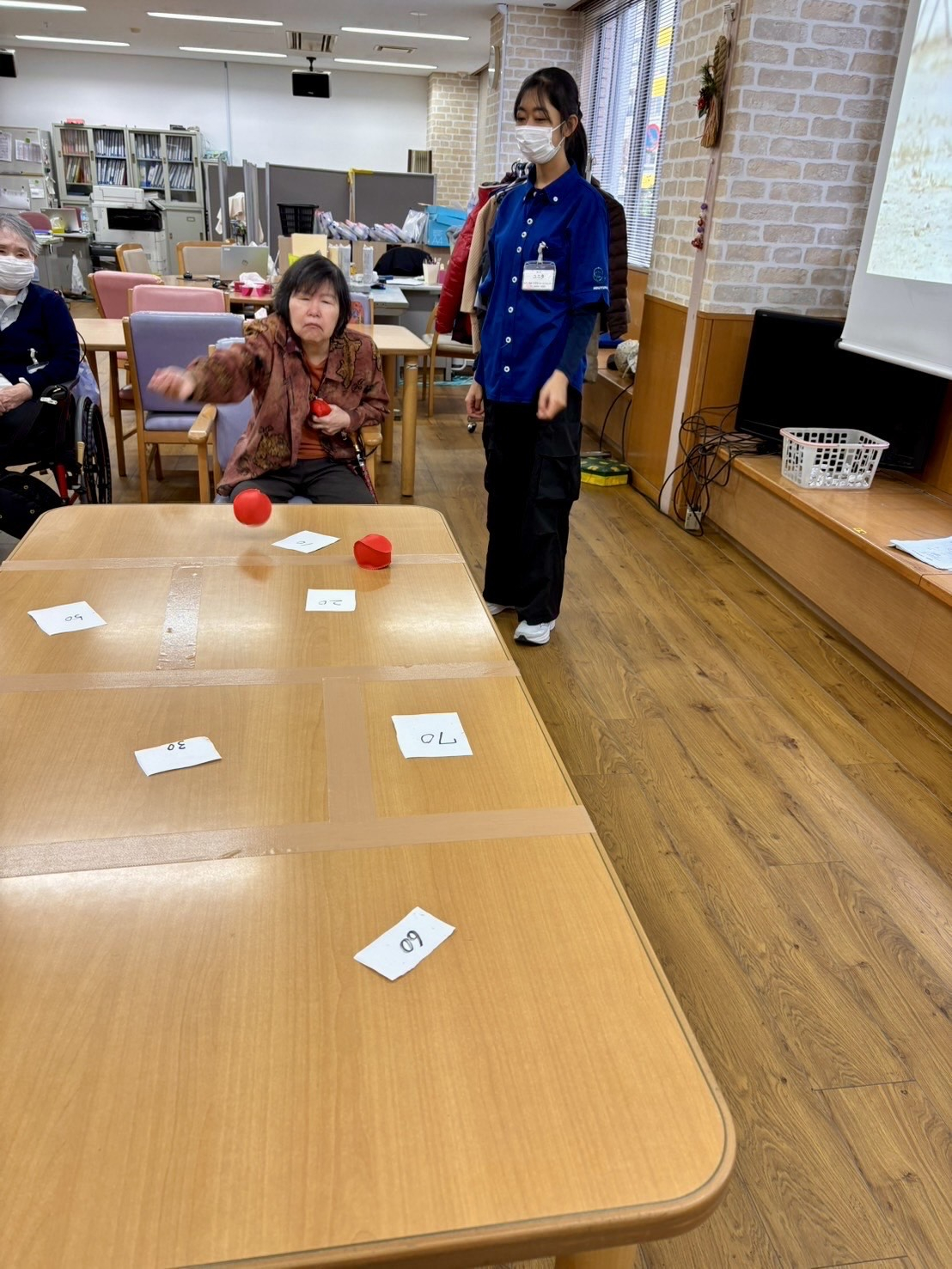 2026.01.07 活動報告 ゲーム(テーブルのせ) Tweet シェアする 本日はテーブルのせゲームに取り組まれております。小さなボールを投げて、得点が書いてある所に乗せるゲームです。高得点になるように皆さん頑張りました。 ひがしデイのゴーテイモ 前の記事 2026.01.07 活動報告 初詣 次の記事 2026.01.06 活動報告 ゲーム(ミニサッカー) 一覧へ戻る