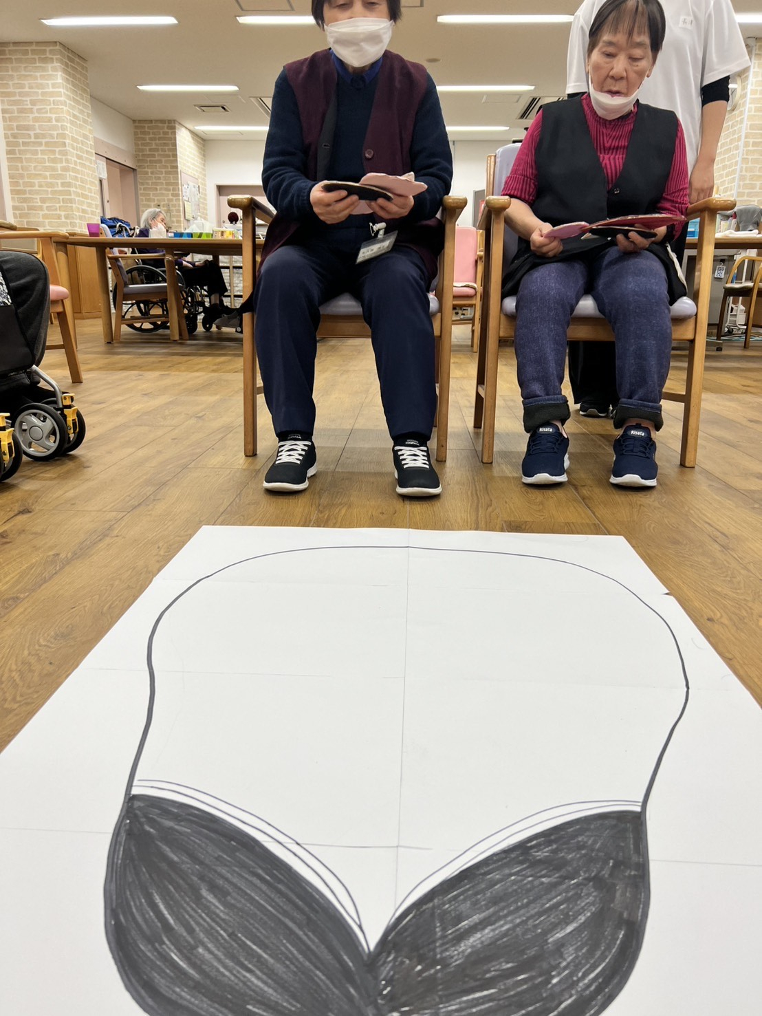 本日は看護実習生さんによる「福笑いゲーム」でお楽しみいただきました。のっぺらぼうに向かって、目や鼻などのパーツを投げます。なかなか思うところには行かない分、いろいろな面白い顔が出来上がりました。
