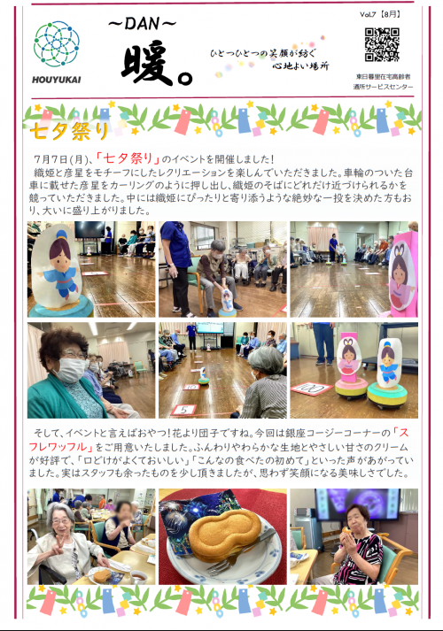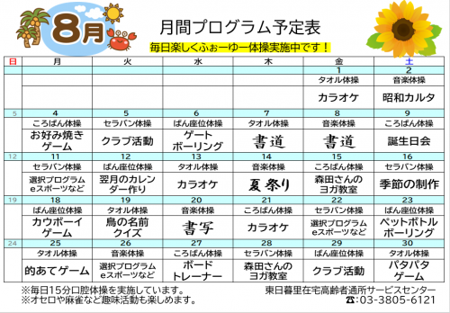 2025.08.13 【東日暮里デイ】明日はなつまつり♪ 活動報告 2025.08.12 【東日暮里デイ】9月のカレンダー作り 活動報告 2025.08.11 【東日暮里デイ】余暇時間 活動報告 2025.08.07 今月の書道は夏らしく! 活動報告 2025.08.04 【東日暮里デイ】午後のレクレーションは!? 活動報告 #デイサービス #レクリエーション #デイ #東日暮里サービスセンター 2025.08.02 【東日暮里デイ】8月のプログラム予定表 活動報告 #デイサービス #イベント #レクリエーション #東日暮里サービスセンター #ゲーム 2025.08.02 昭和カルタ 活動報告 2025.08.02 【東日暮里デイ】献立表 活動報告 #デイサービス #デイ #お食事 #行事食 #食事 #東日暮里サービスセンター 2025.08.01 暖~DAN~8月号 お知らせ 2025.07.31 ウナギイベント 活動報告 2025.07.26 書写 活動報告 2025.07.26 今日も皆さまの力でタオルがきれいに整いました 活動報告 2025.07.25 誕生日会 活動報告 2025.07.23 【東日暮里デイ】カラオケ 活動報告 2025.07.22 【東日暮里デイ】麻雀! 活動報告 1 2 3 4 5 … 22