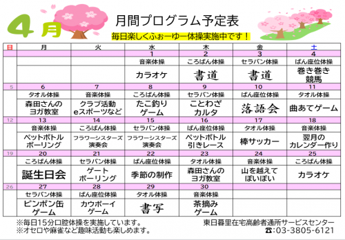 2026.04.02 【東日暮里デイ】4月の予定表をお知らせします 活動報告 #デイサービス #レクリエーション #レク #いつもありがとうございます 2026.03.09 【東日暮里デイ】2月の落語会開催です♬ 活動報告 #デイサービス #レクリエーション #いつもありがとうございます #落語 2026.01.05 【東日暮里ディ】あけましておめでとうございます 活動報告 #デイサービス #荒川デイ #東日暮里サービスセンター #いつもありがとうございます