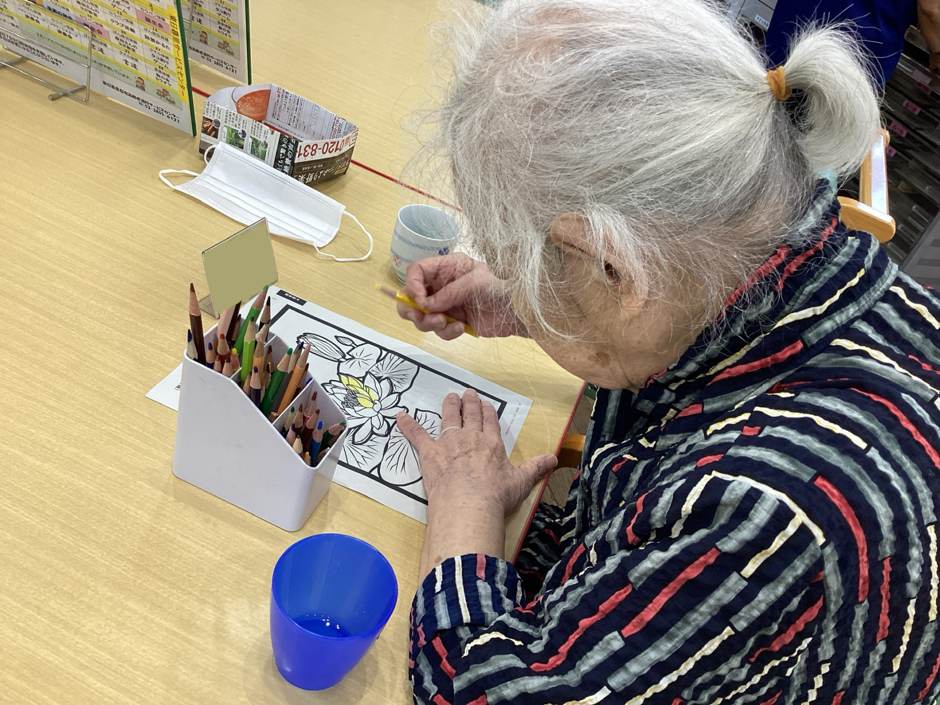 塗り絵や学習プリントをご用意しております。自分が好きなものや、やりたいプリントを選んでお席に持って行き熱心に取り組まれています。「今日はどれにしようかな?」