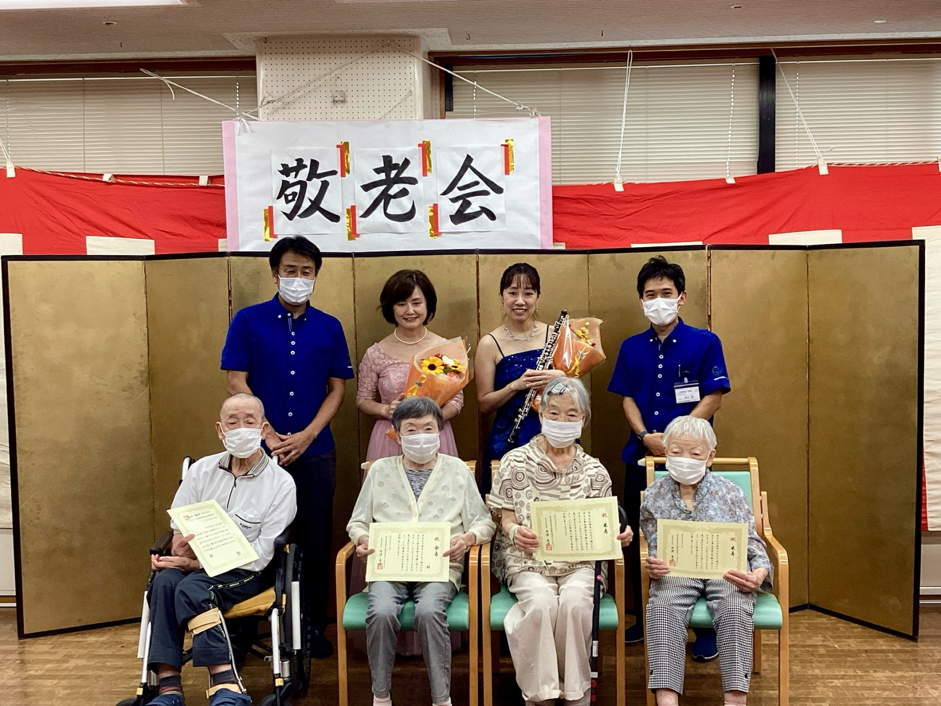 演奏会の後には、傘寿や卒寿など、節目のご年齢を迎えられた方々への表彰状授与式が行われました。受賞された皆さんの笑顔が、これまでの人生の素晴らしい節目を讃えるかのよう。たなかや音楽工房のお二人も一緒に記念写真を撮り、一層記念に残る瞬間となりました。