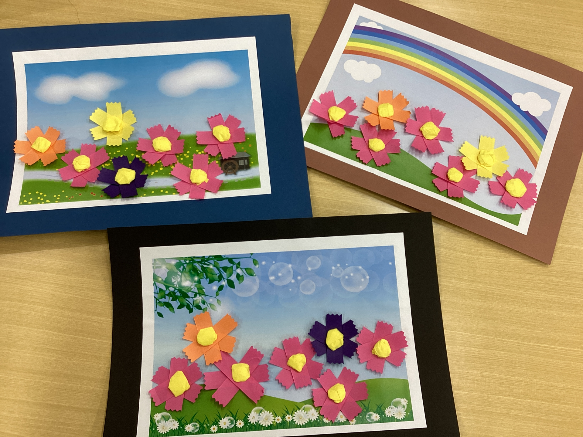 9月18日(水曜日)の午後は、季節の制作でコスモスの壁飾りを作りました。