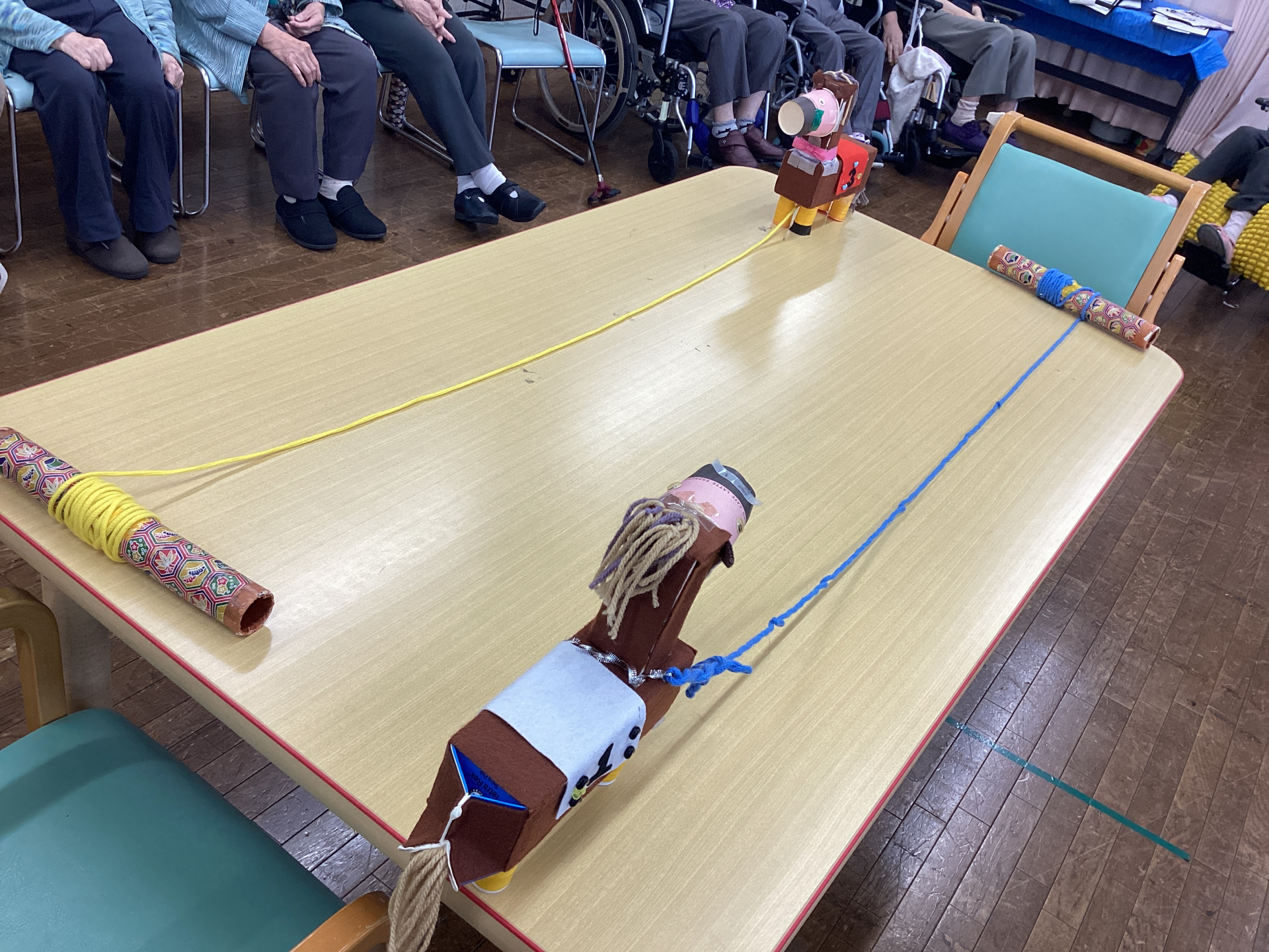 職員手作りの競走馬の手綱を一生懸命に手繰り寄せ、チーム一丸となり、レースを繰り広げました。