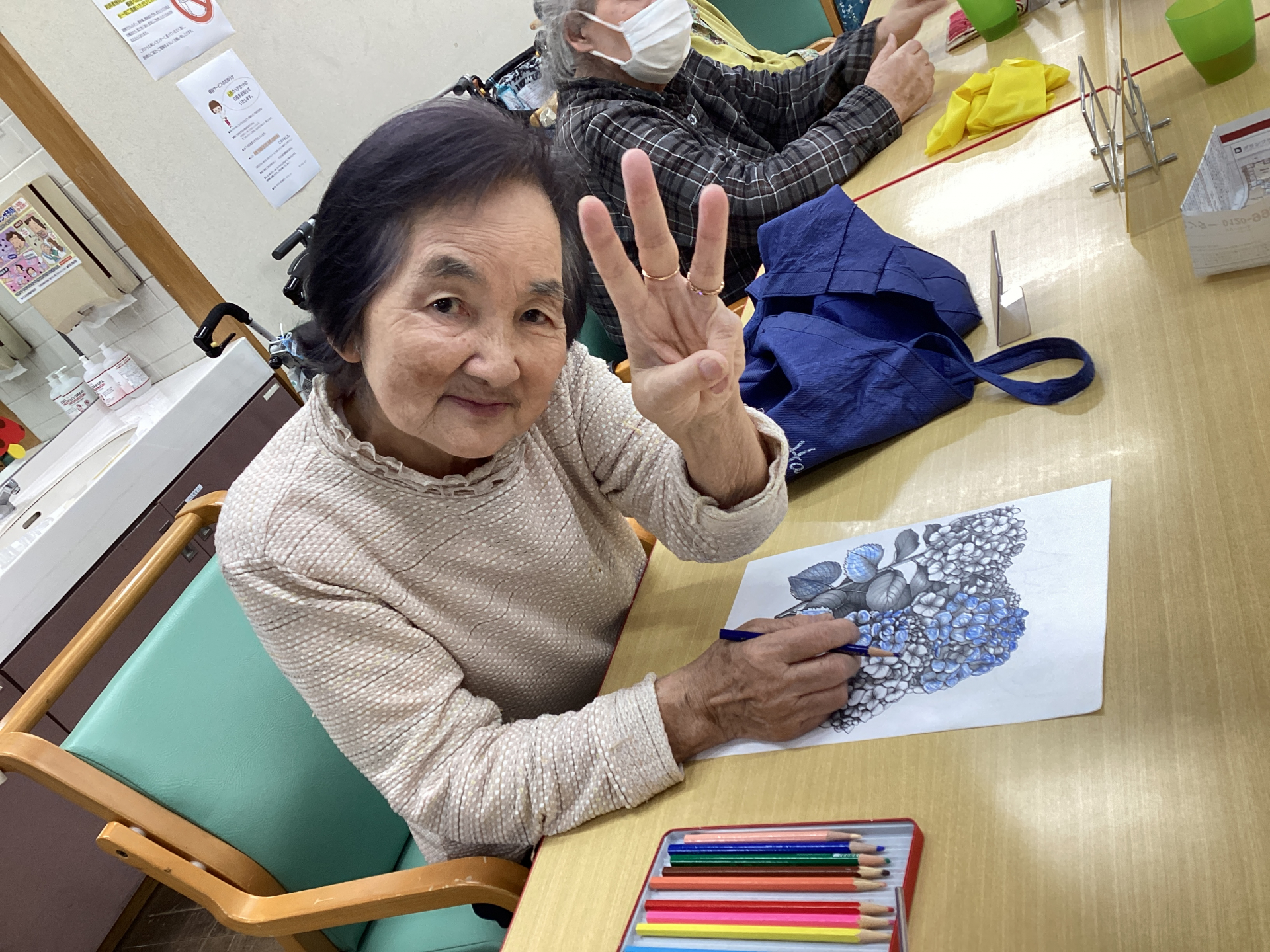「この色が好きなのよ」「次はこの花を塗ろうかしら」と、自然と会話も弾みます。塗り絵は、指先の運動や集中力を高めるだけでなく、気分転換にもつながる大切な活動のひとつです。