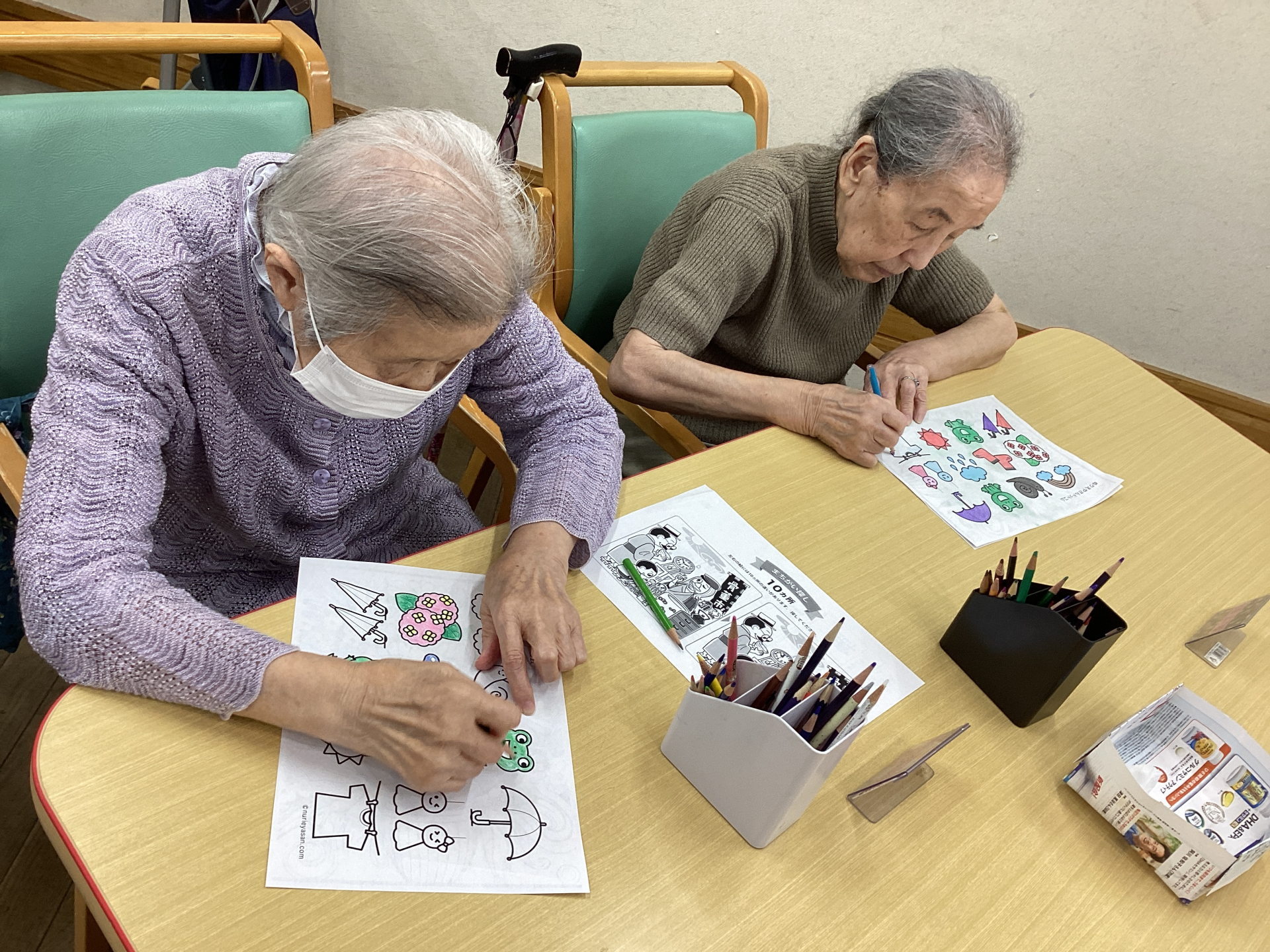 午前中の脳トレ時間に、ふと塗り絵に取り組まれる利用者さまの姿がありました。色鉛筆を手に、じっくりと色を重ねていく様子はとても穏やかで、時間がゆっくりと流れているように感じられます。