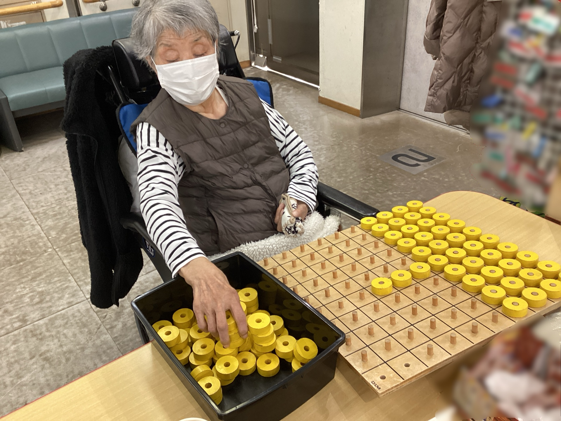 東日暮里デイサービスでは、ご利用者一人ひとりに合わせた個別機能訓練を行っています。今回は、上肢の動きや巧緻性(細かい動き)の維持・向上を目的に、ペグボードに取り組む様子をご紹介します。