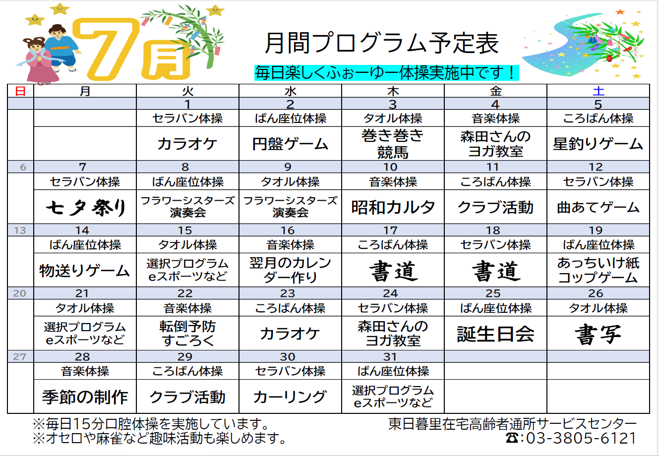 2025.07.01 活動報告 【東日暮里デイ】7月プログラム表 Tweet シェアする 皆様こんにちわ!東日暮里デイのプログラムをご紹介します。 7月は 「七夕祭り」 が7日にあります。 笹を飾って皆様に書いていただいた 短冊 を飾ります! ぜひお楽しみに~! 東日暮里デイ H/E #デイサービス #レクリエーション #東日暮里サービスセンター #レク #イベント 前の記事 2025.07.02 活動報告 【東日暮里デイ】7月献立表 次の記事 2025.06.30 活動報告 【東日暮里デイ】曲当てゲーム 一覧へ戻る