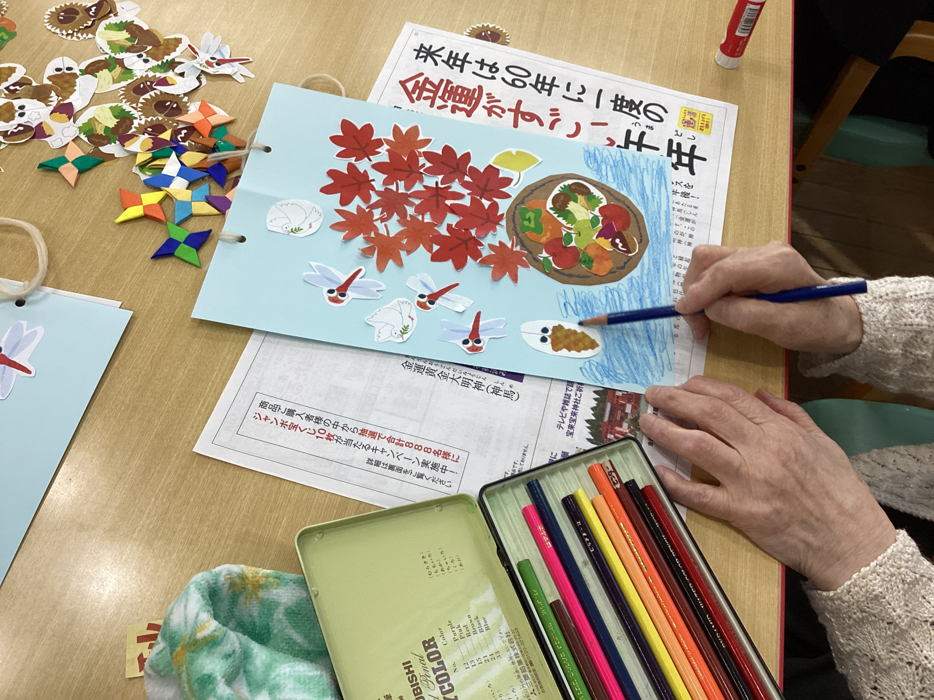 茶色の丸い台紙を“お皿”に見立て、柿や栗、りんごなどの秋の実りを一つひとつ丁寧に貼り付けて頂きました。周りにはトンボや蓑虫も飾り、季節感たっぷりのにぎやかな作品に仕上がっています。