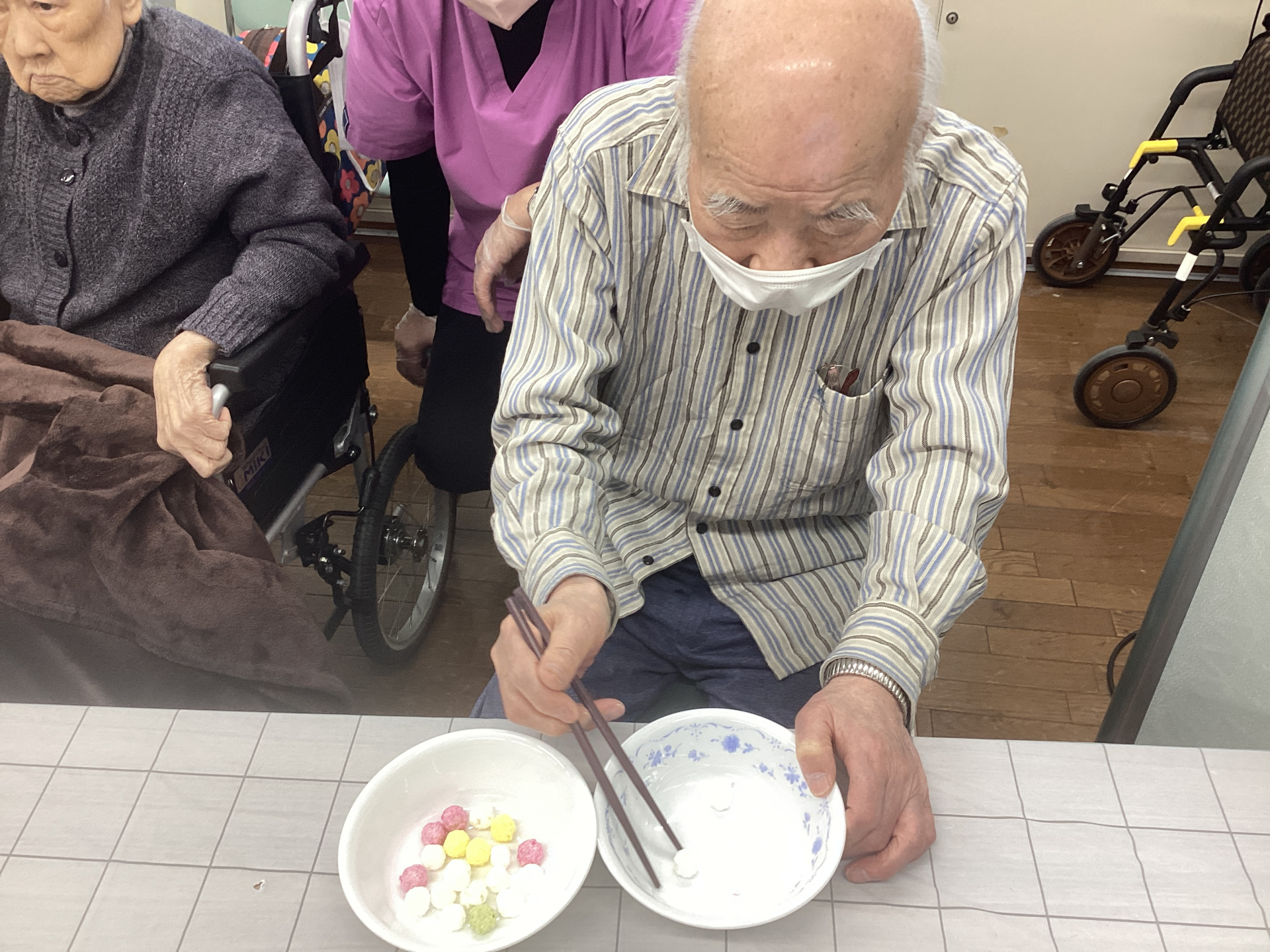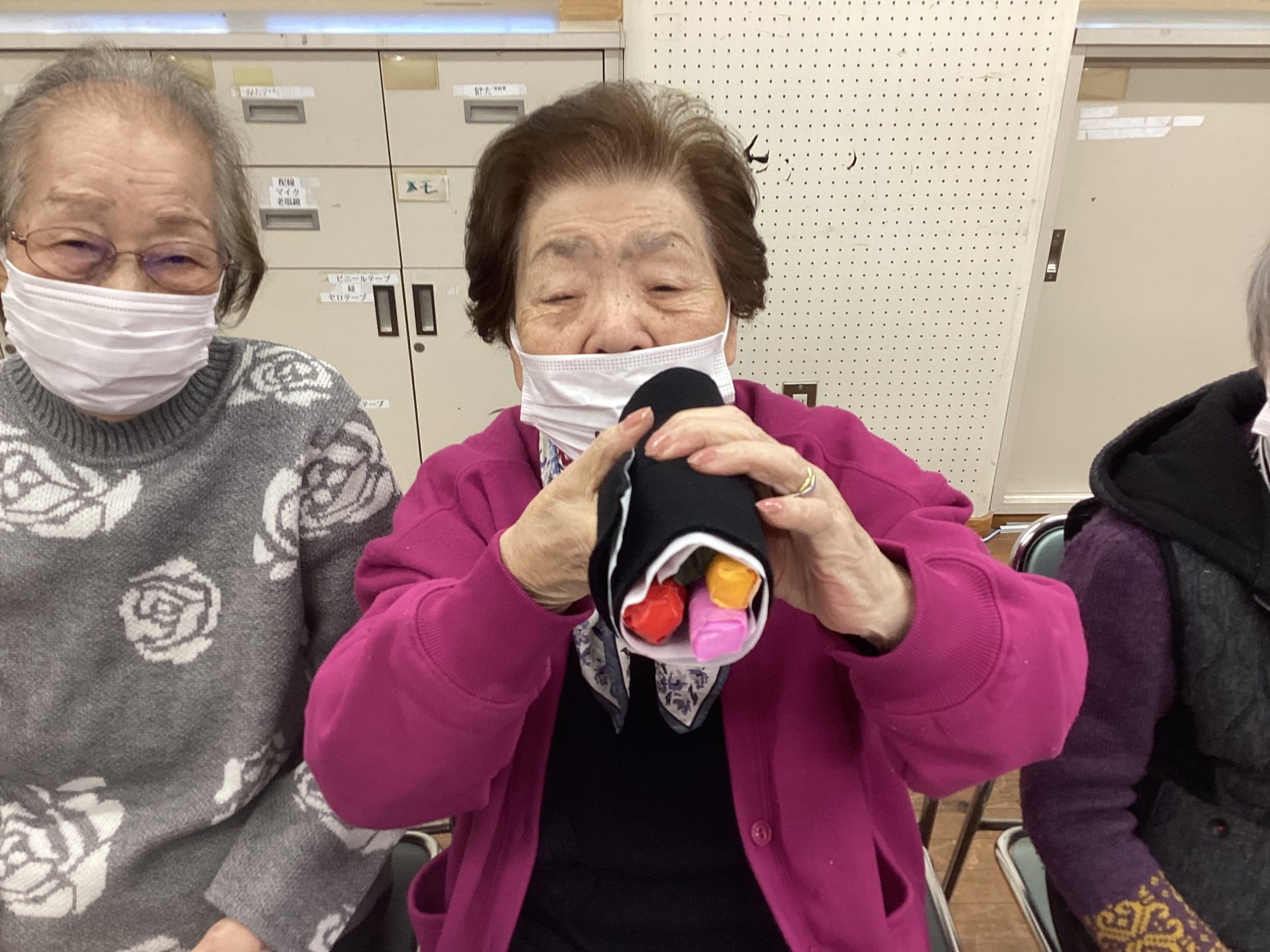 その後は『恵方巻リレー』で、恵方巻を作っていただき、『あられ掴みリレー』も行いました