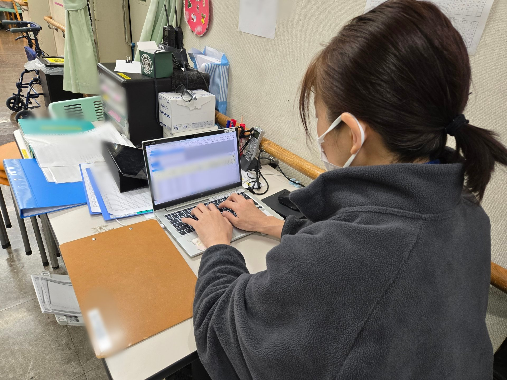 フロアの様子を見守りながら、連絡帳や記録の作成を進めます。