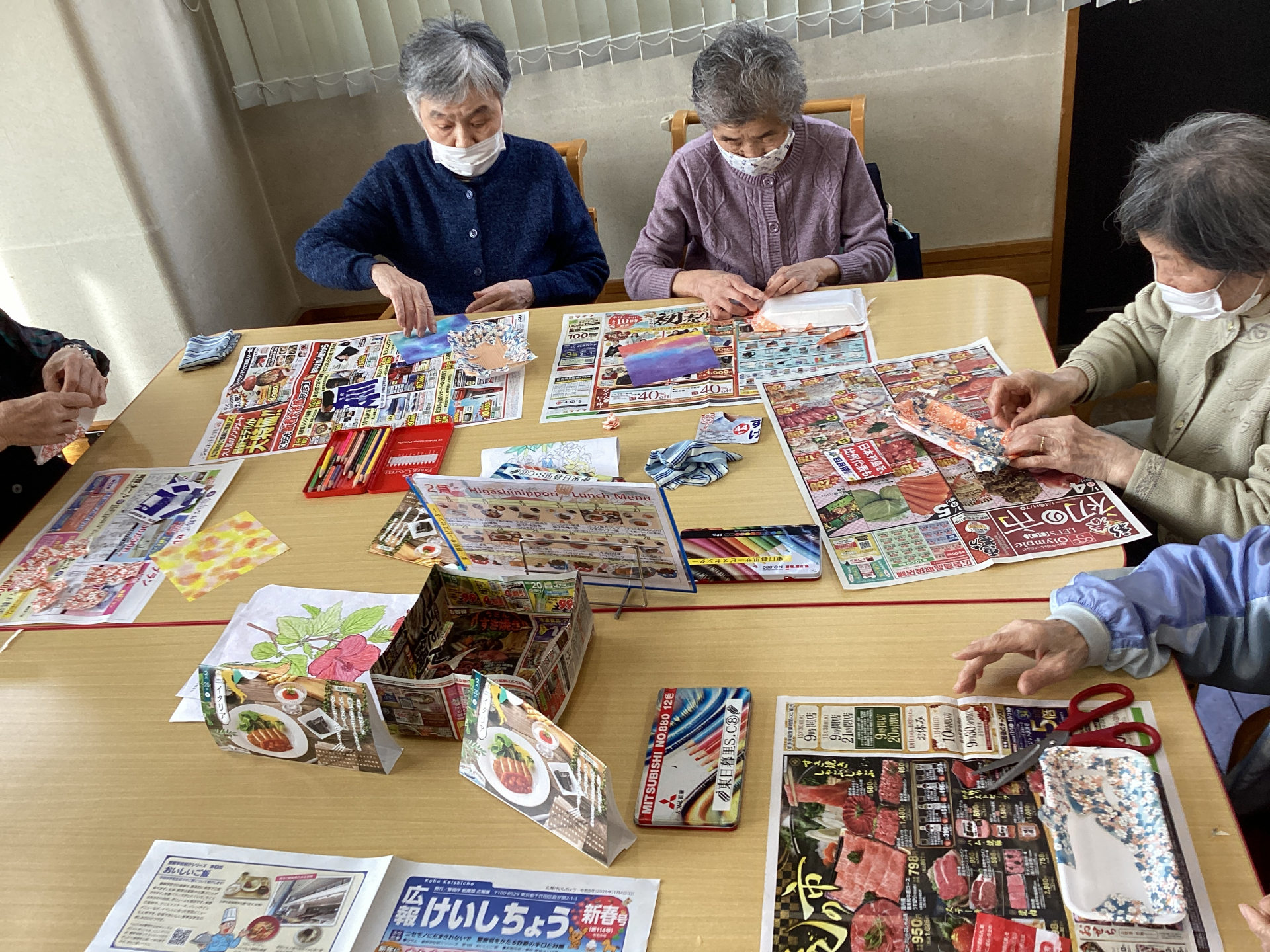 「ここはこの色がいいかな」「きれいだね」とお話ししながら、皆様とても集中されたご様子でした。指先を使う作業は良い刺激にもなり、完成した作品を手にすると、にっこり笑顔も見られました。