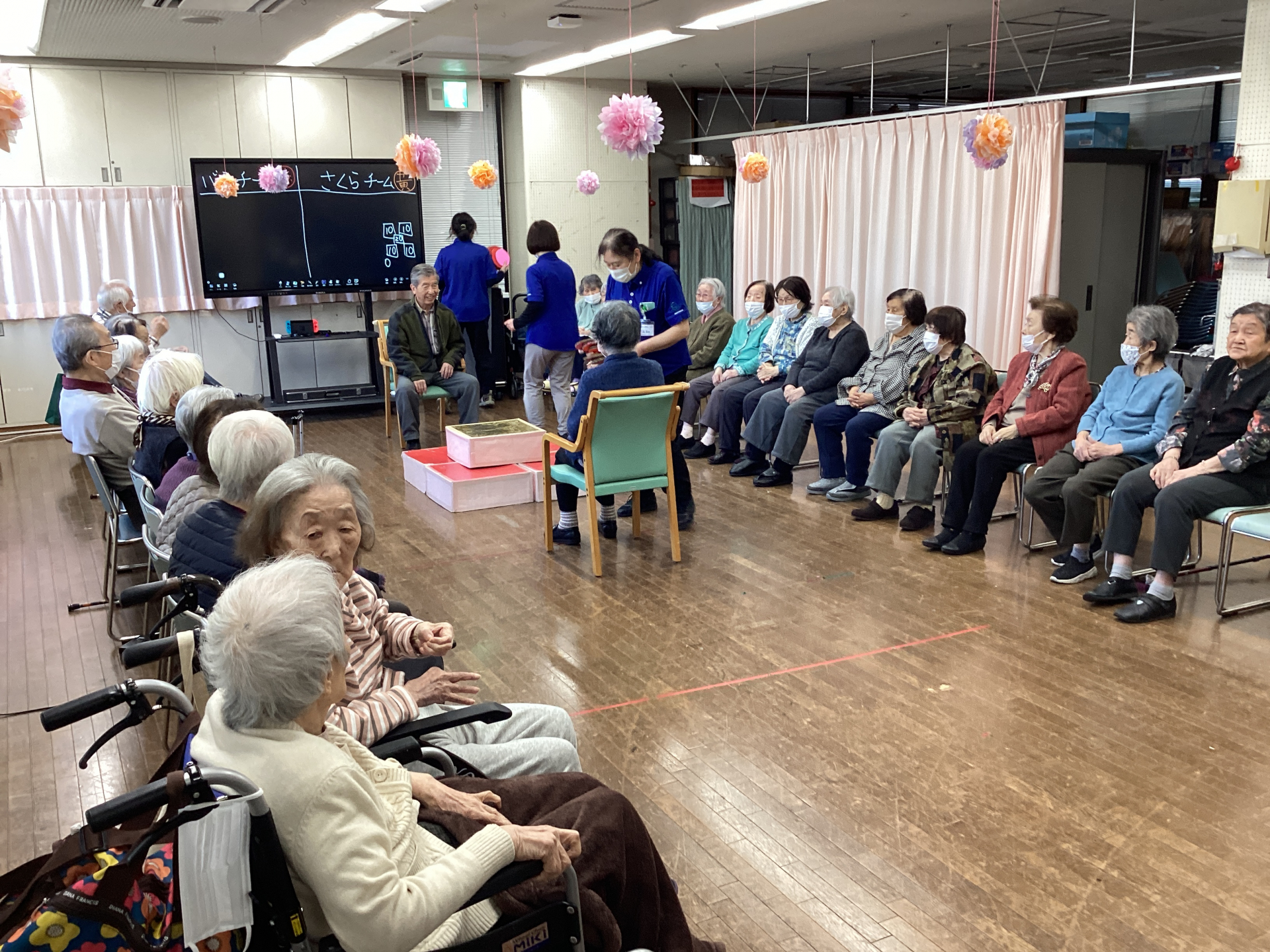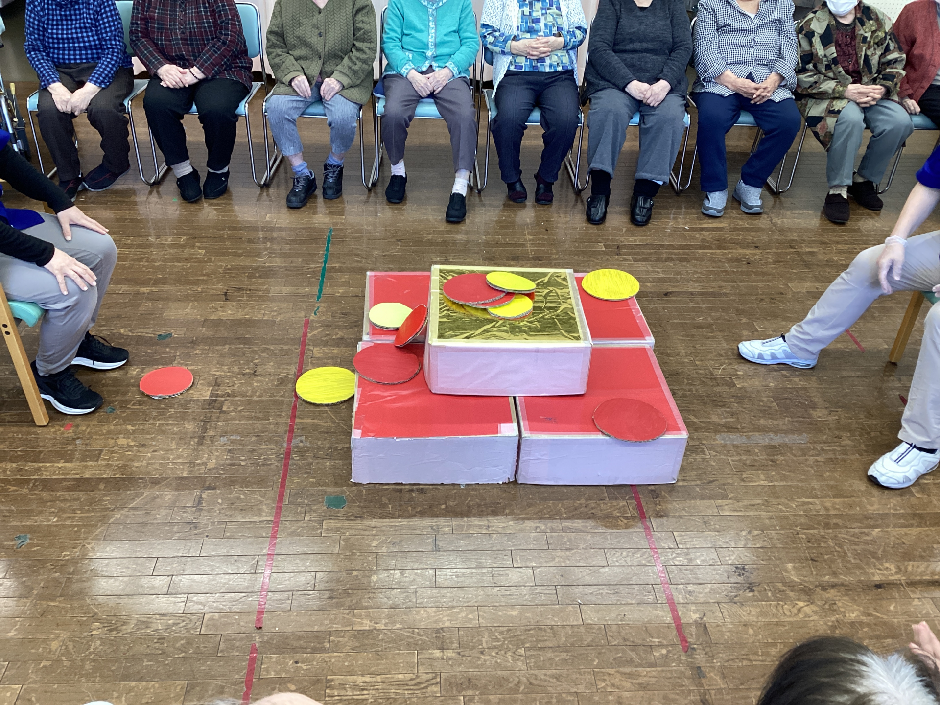 段違いになった箱の上に円盤を投げ、乗った場所の点数を競うゲームです。今回は「さくらチーム」(黄色)と「バラチーム」(赤)に分かれて対戦しました。
