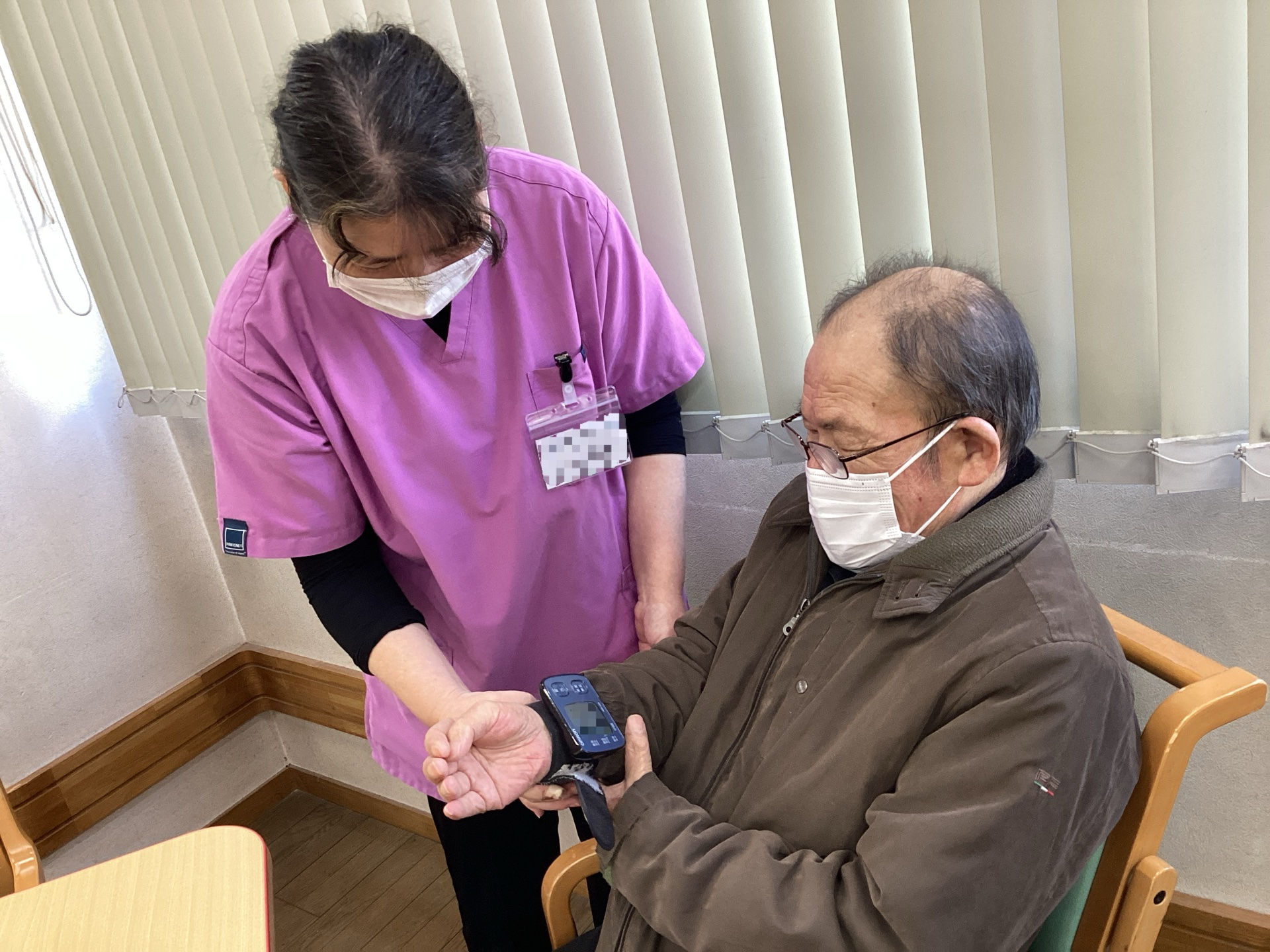 ご利用者が来所されたら、血圧や体温などのバイタル測定を行います。