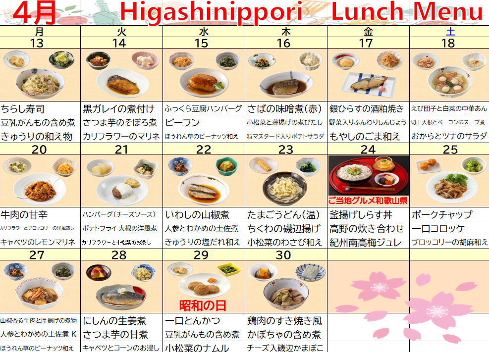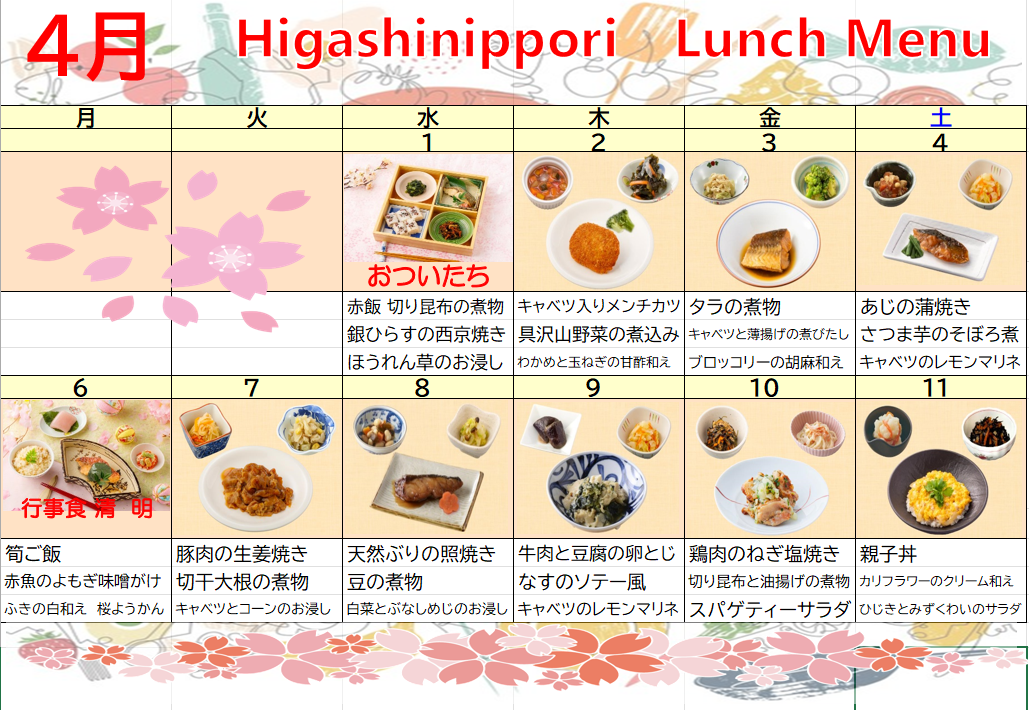 【東日暮里デイ】4月の献立表をお知らせします♪