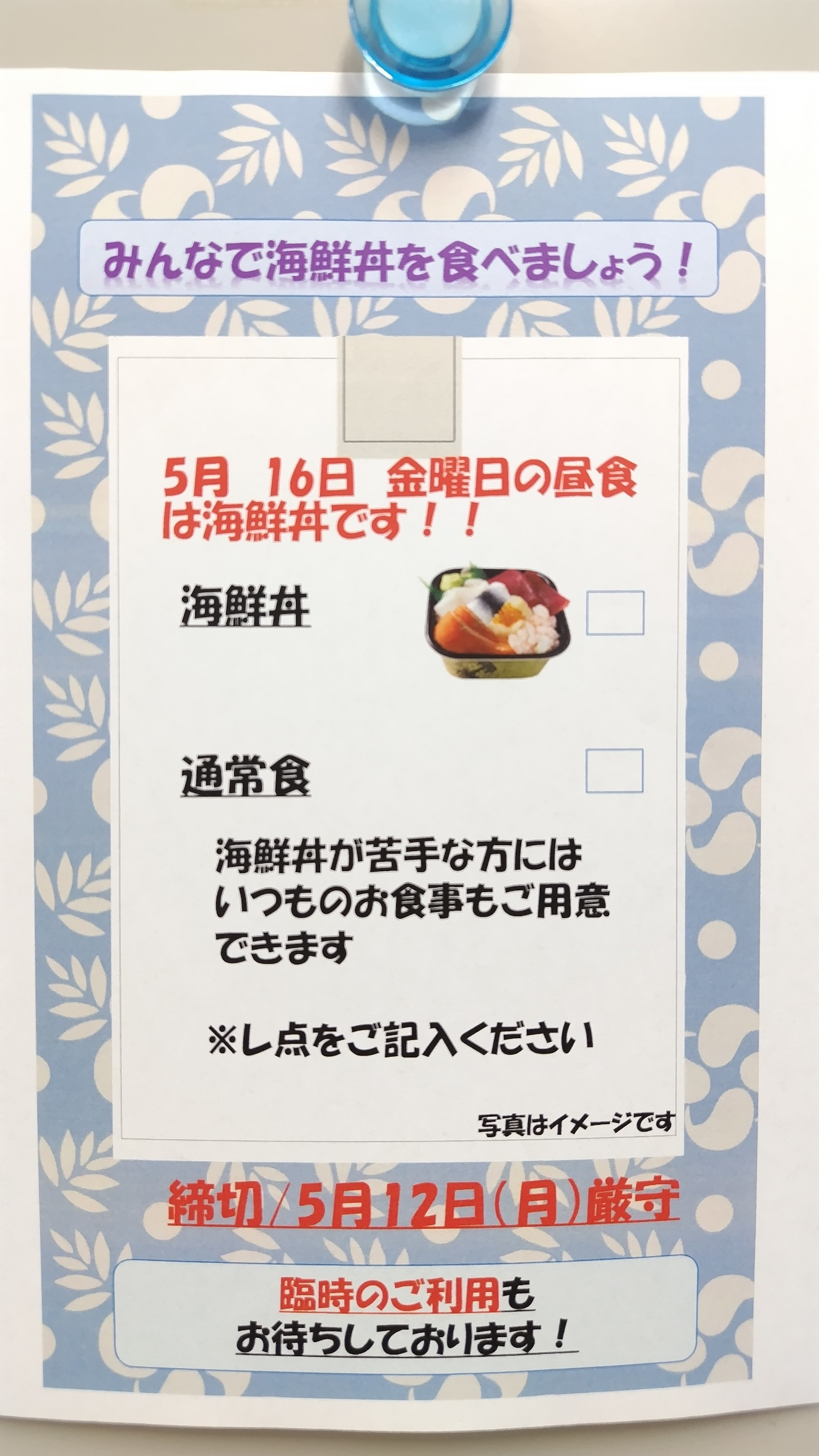 「海鮮丼」と「通常食」のどちらを希望か記入し、お返事くださいね。