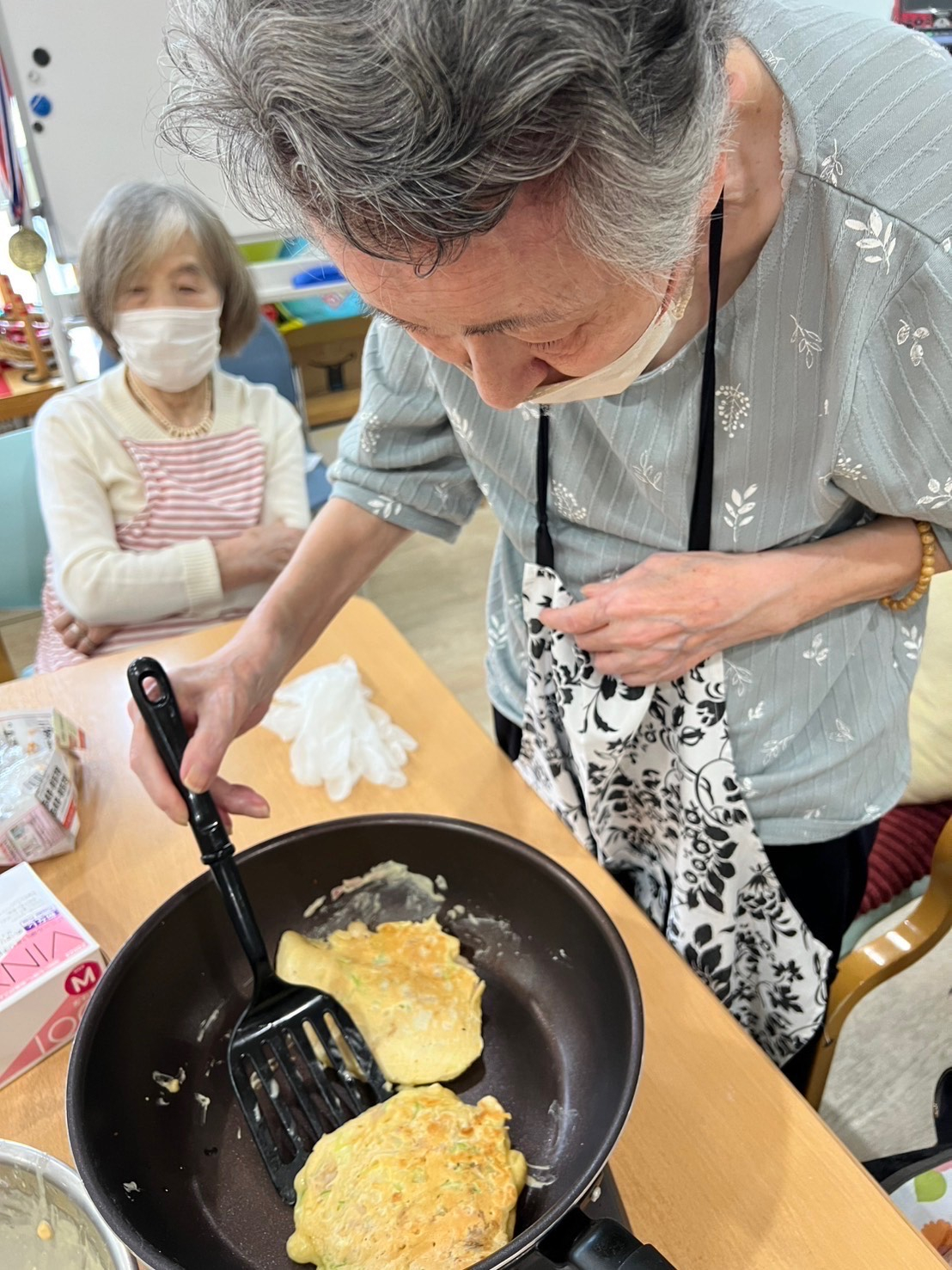 鉄板組とフライパン組に分かれてフライパン返しでひっくり返して