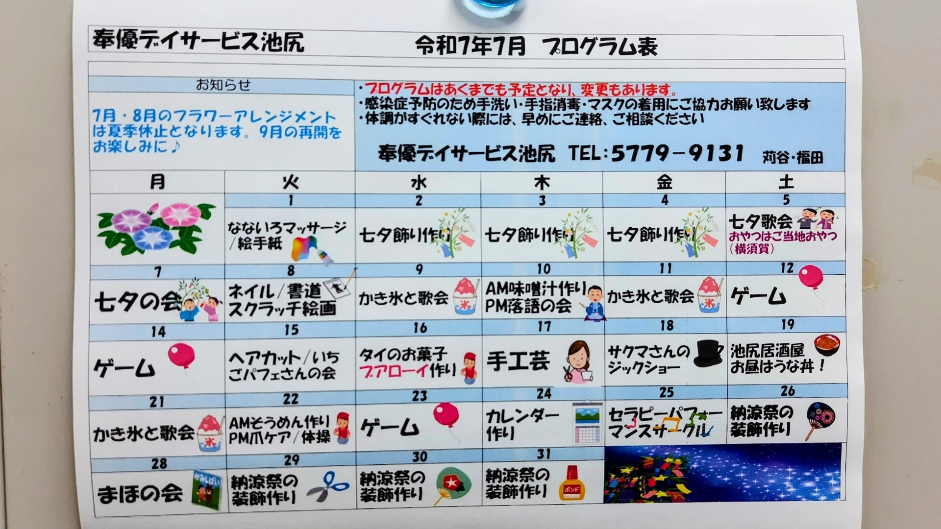 2025.07.04 デイサービス 7月プログラム表 Tweet シェアする 皆様、こんにちは。 7月のプログラム表をお知らせします 暑い夏は池尻デイで楽しく過ごしましょう! 臨時でご参加もお待ちしております♪ 奉優デイサービス池尻 ふっく 前の記事 2025.07.07 デイサービス おみやげは金魚 次の記事 2025.07.01 デイサービス 絵手紙 一覧へ戻る