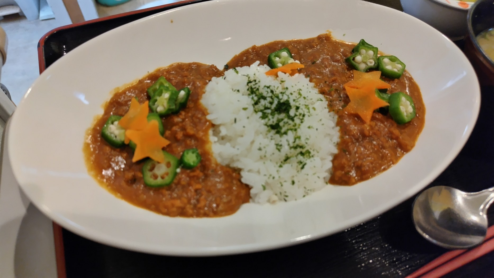 スパイシーなキーマカレーに星型の人参とオクラをちりばめて